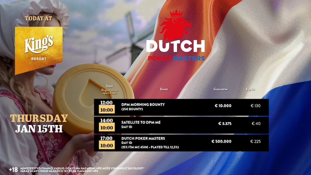 Das Festival läuft bis zum 19. Januar und im Mittelpunkt steht das €225 Dutch Poker Masters Main Event mit einer €500.000 Garantie. Neun Starttage und ein Flip & Go werden im King’s angeboten, einen Starttag wird es in Prag geben. Alle Überlebenden werden am Sonntag, den 18. Januar für den Tag 2 an die Tische zurückkehren und das Finale findet am Montag, den 19. Januar statt.
