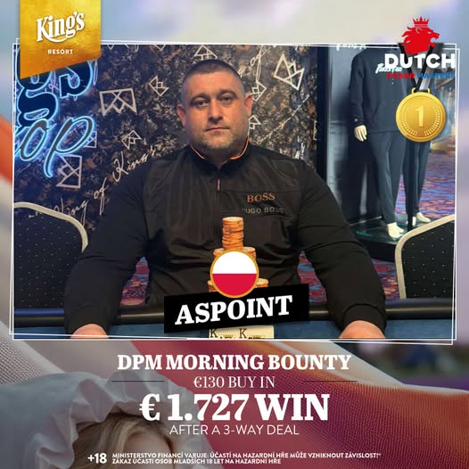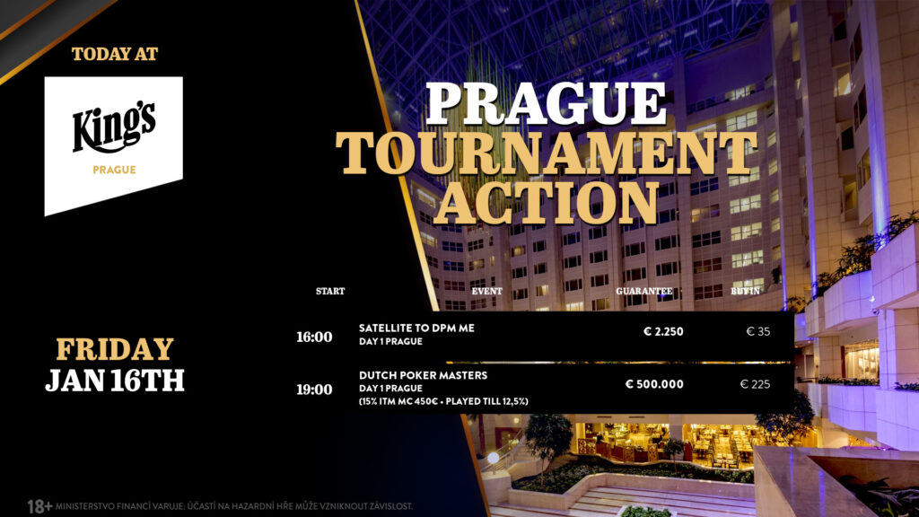Neben dem DPM Main Event wurde am Donnerstag im Rahmen der Dutch Poker Masters (DPM) powered by Pokerreis auch das DPM Morning Turbo im King’s Resort Rozvadov ausgespielt. Hier sollte sich am Ende ein Trio den Sieg und einen großen Teil des €11.902 Preispools teilen. In der Nacht von Donnerstag auf Freitag wurde dann auch im Hilton Hotel Prag, wo das King’s Casino Prague beheimatet ist, Turnierpoker gespielt: Beim Mystery Bounty Thursday ging es um garantierte €10.000 und darin auch um 2 King of King’s (KoK) Tickets.