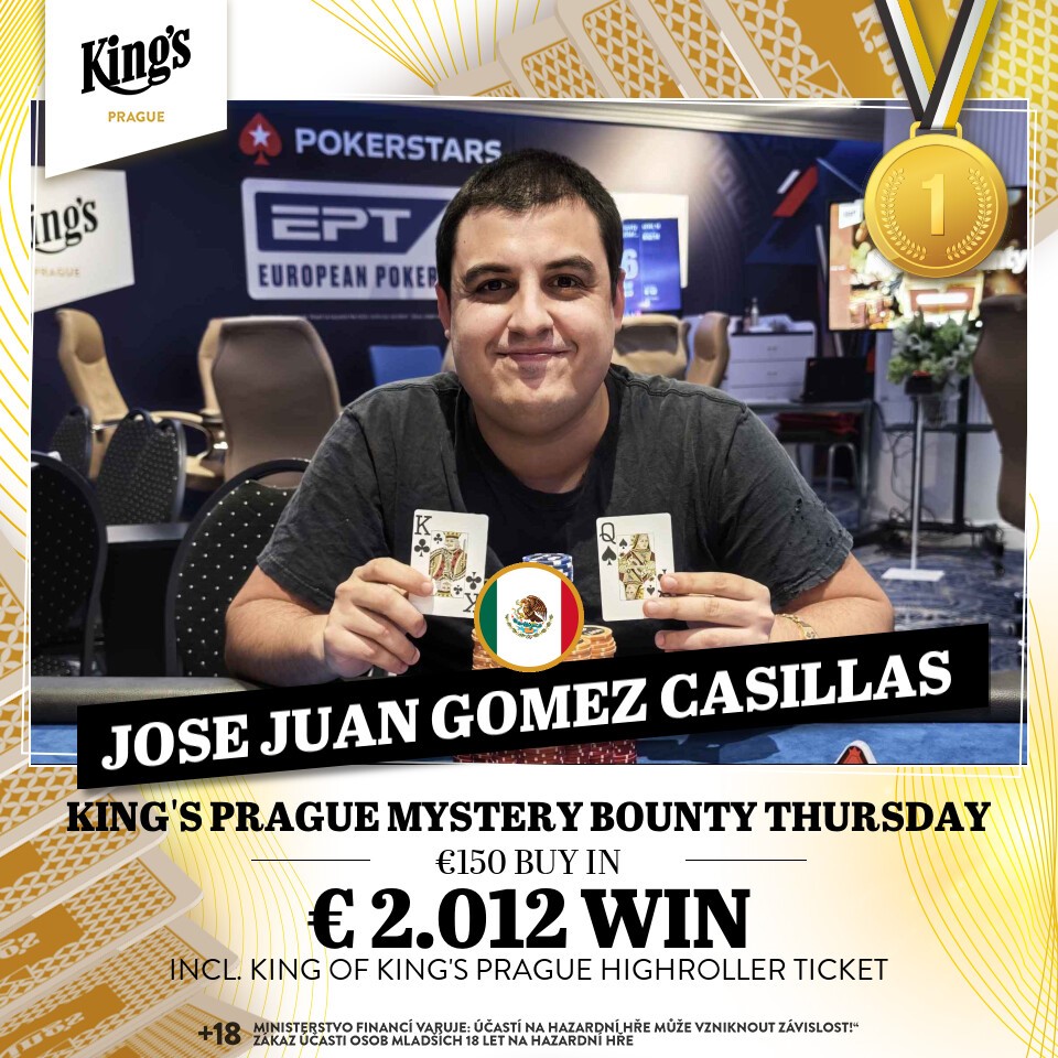Deutschsprachige Spieler schafften es am Donnerstag in Prag nicht ITM, dafür landete der polnische Dauercasher „KARLOS“ auf Rang 6 mit €312 Payout im Geld. Als auf Rang 3 der Tscheche Pavel Novak mit €696 Preisgeld ausgeschieden war, war auch die Ticket Bubble geplatzt. Im Heads-Up musste sich als bester lokaler Spieler Petr Bulir mit der Runner-Up-Position und €1.592 aus dem regulären Preispool zufrieden geben. Der Sieg samt €2.012 und der letzten beiden sowie weiterer eingesammelter Bountys ging im Mystery Bounty Thursday nach Mexiko, an den King’s Regular Jose Casillas.