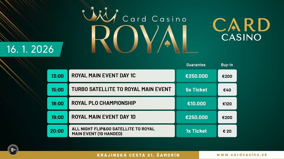 Eine Viertelmillion Euro sind auch bei der Januar-Ausgabe vom beliebten ROYAL Main Event im Card Casino Samorin garantiert. Um die kann mit lediglich €200 Startgeld gespielt werden. Dafür erhält man 100.000 Starting Chips und 30 Minuten Spielzeit pro Level (20 Minuten im Turbo, 12 Minuten im Hyperturbo). In insgesamt 10 Flights, davon 2 Flip and Gos, kann man sich für Tag 2 (SO, 17:00 Uhr) des 3-Day-Events qualifizieren. Dort werden die Blindlevel dann auf 40 Minuten verlängert, im Finale (MO, 16:00 Uhr) dann sogar auf 60 Minuten.