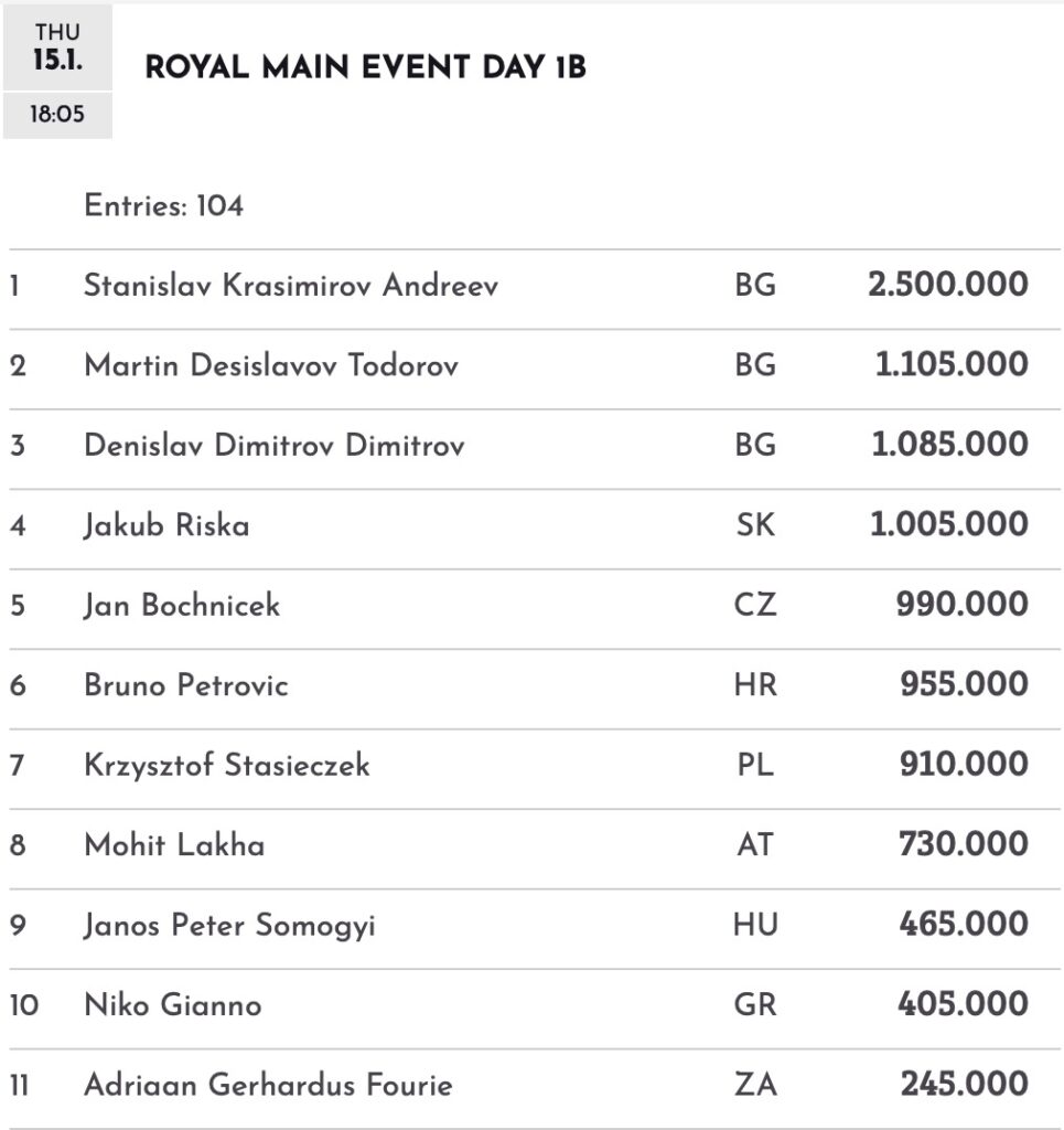 Ein unaufhaltsam starke und wahrlich royale Vorstellung sollte an Tag 1B ein bulgarisches Trio bieten. Als Dritter und Zweiter der Tageswertung tüteten Denislav Dimitrov (1.085.000) und Martin Todorov (1.105.000) Millionenstacks ein. Den Vogel schoss jedoch ihr Landsmann Stanislav Andreev ab. Der Bulgare schnappte sich nicht nur den Tag-1B-Chiplead, sondern ist mit 2,5 Millionen erspielten Chips auch der neue Overall Chipleader. – Schon an Tag 1A hatte Bulgarien mit Veselin Moskovski einen Monsterchipleader gestellt, der allerdings mit 2 Chips weniger in Tag 2 geht als sein Landsmann Andreev.