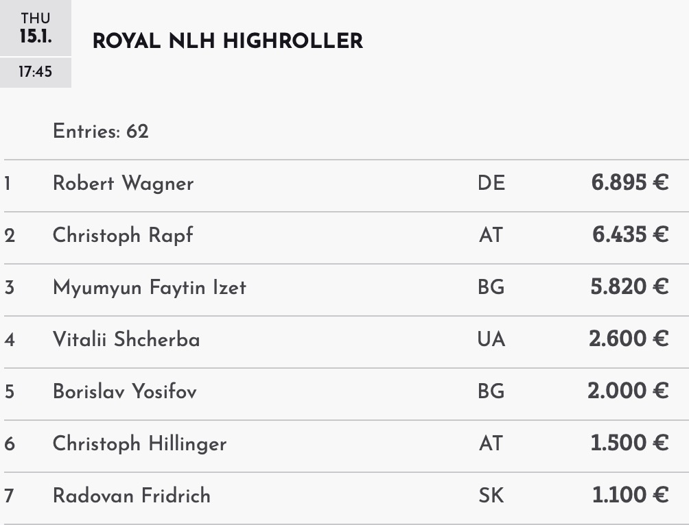Die erste royale Titel des Pokerjahres wurde im ROYAL NLH High Roller vergeben. 62 Entrys, größtenteils CC-Regs zahlten die €500 Startgeld und sorgten somit für €26.350 im Preispool. Der sollte auf die Top-7 aufgeteilt werden. Darunter landeten nicht nur zwei weitere bulgarische Spieler, sondern auch 3 aus der D-A-CH-L Region. Der vielleicht bekannteste deutschsprachige Spieler im Card Casino SK, wurde mit Christoph Hillinger 6. im HR Event. Der österreichische Seriensieger nahm zwar keinen weiteren CC-Titel, dafür €1.500 Preisgeld mit.