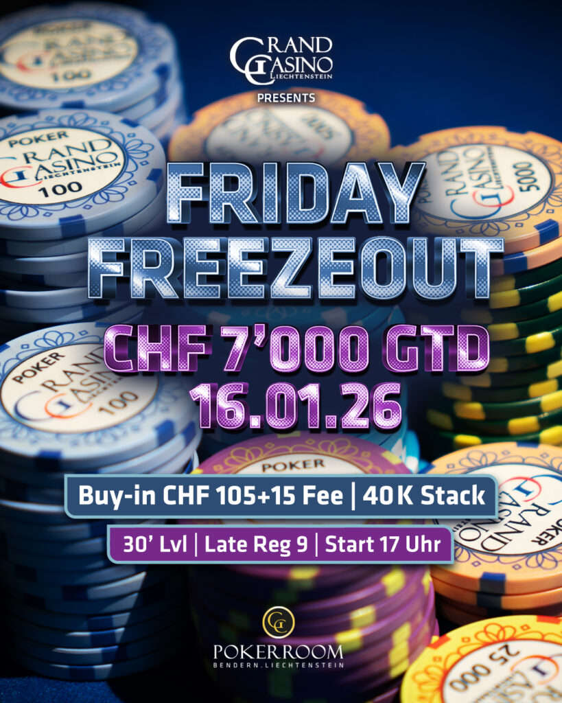Ab 17:00 Uhr wird im GC Pokerroom Bendern heute das Friday Freezeout gespielt. Für 105+15 CHF Buy-In wird es zum Start 40.000 Starting Chips und 30 Minuten Spielzeit pro Level geben. Die Late Registration ist 9 Level lang für Spätstarter*innen geöffnet. Re-Entrys sind im Freezeout-Format natürlich nicht erlaubt. Die Preisgeldgarantie beträgt 7.000 CHF!