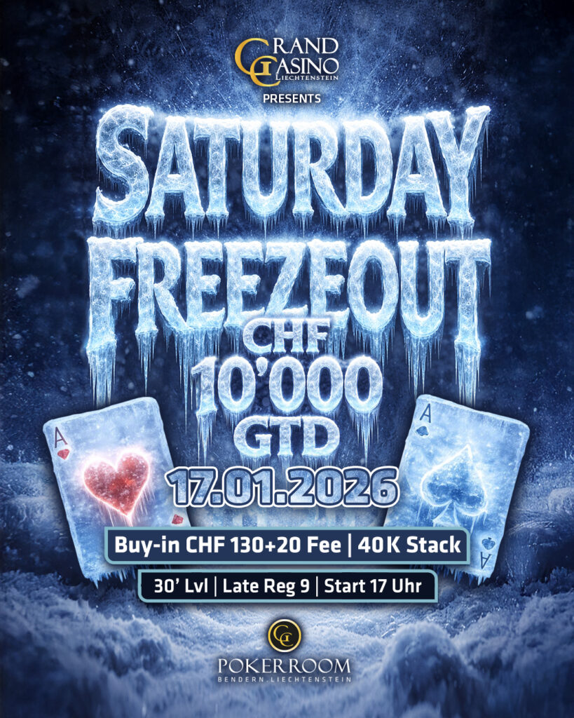 Am Freitagabend wurde im GC Pokerroom vom Grand Casino Liechtenstein (GCLI) das Friday Freezeout ausgetragen. 103 Entrys ließen sich das Pokerturnier ohne Netz und doppelten Boden nicht entgehen. Damit wurde die 7k-Garantie klar übertroffen und um 10.815 CHF gepokert. Am Ende sollten sich die Top 3 auf eine Teilung einigen.