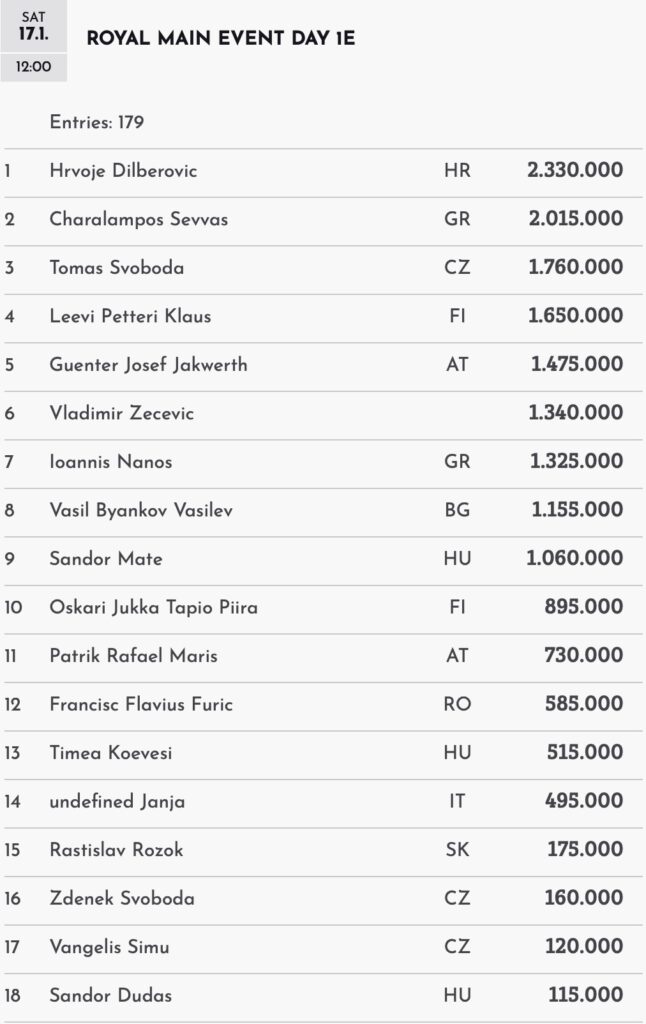 Starttag 1E vereinte 179 Entrys im royalen Main Event. 18 von ihnen fanden am Ende des Spieltages eine Tüte für den heutigen Tag 2 an ihrem Platz, darunter auch 2 Österreicher. Patrik Maris beendete den Flight mit 730.000 Chips als 11. im Zwischenklassement. Sein Landsmann Günter Jakwerth schloss den Starttag als 5. mit 1.475.000 erspielten Jetons ab. Auf dem virtuellen Podium des Flights landeten Tomas Svoboda aus Tschechien mit 1.760.000 und Charkalampos Sevvas aus Griechenland mit 2.015.000 Chips, sowie der Tag-1E-Chipleader Hrvoje Dilberovic aus Kroatien mit einem 2.330.000er Stack.