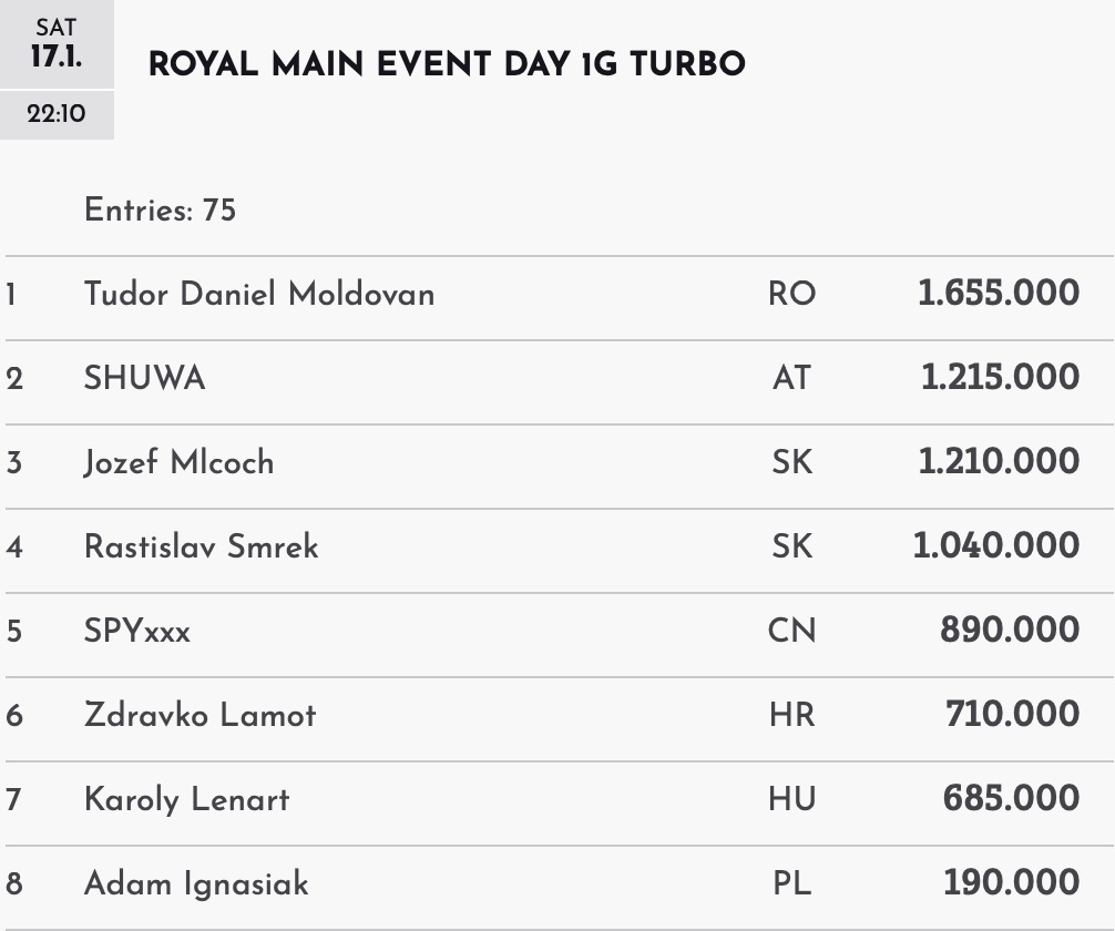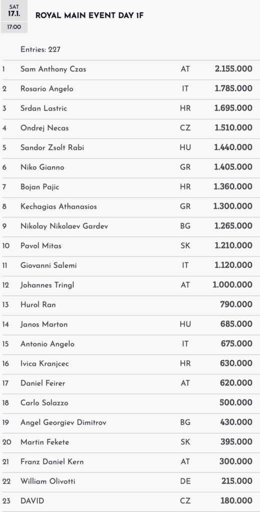 ROYAL Main Event Flight 1F war mit 227 Entrys der bislang bestbesuchte. Das bedeutete auch, dass es 23 Quali-Spots für Tag 2 des 3-Day-Events geben sollte. Unter die schafften es auch 5 deutschsprachige Teilnehmer. Zu den shorteren Stacks zählten William Olivotti aus Deutschland mit 215.000 und Franz Kern aus Österreich mit 300.000 Chips auf den Rängen 22 und 21. Etwas komfortabler wird der Österreicher Daniel Feirer mit 620.000 Chips in die heutige Main-Event-Fortsetzung gehen, womit er den Starttag auf Rang 17 beendete. Als 12. landete sein Landsmann Johannes Tringl mit genau 1 Million erspielter Chips im exakt in der Mitte des Tableaus. Bester deutschsprachiger Spieler und gleichzeitig bester des Flights überhaupt wurde Sam Czas aus Österreich. Mit 2.155.000 Jetons hatte er am Ende sogar auf seine nächsten Verfolger, Rosario Angelo aus Italien (1.785.000) und Srdan Lastric (1.695.000) aus Kroatien noch einen Puffer herausgespielt.