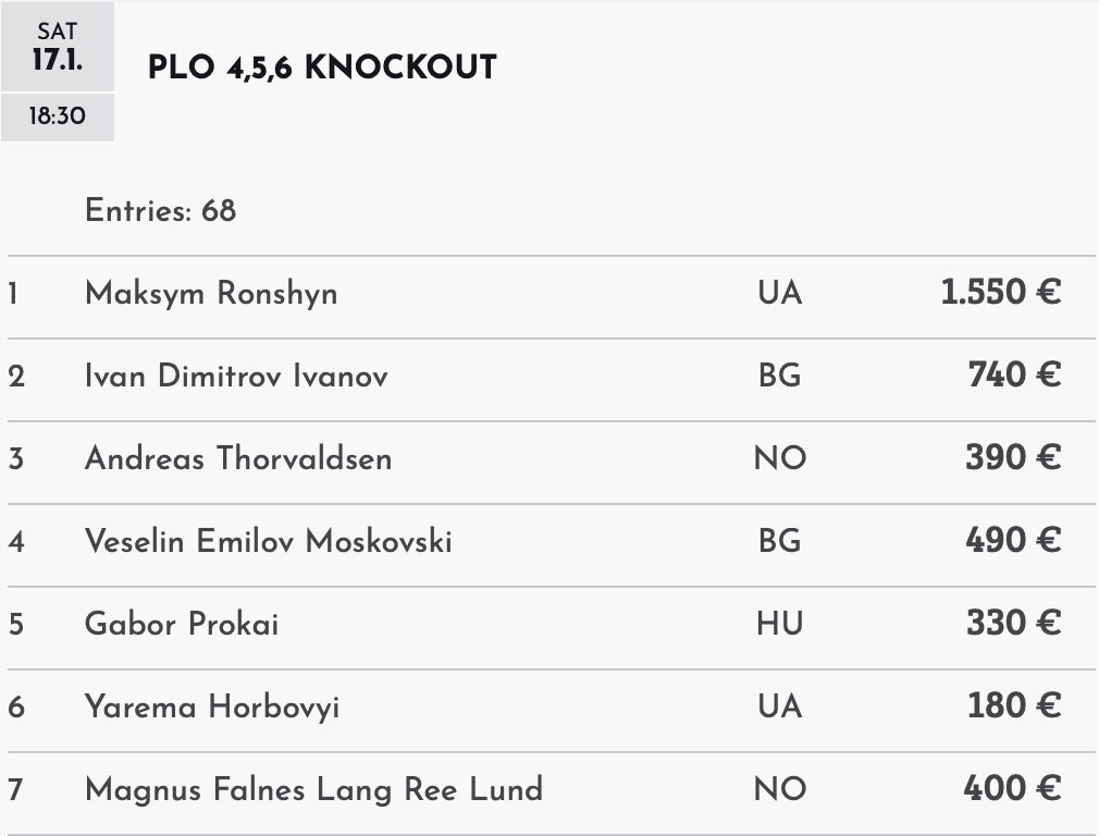 Deutschsprachige Spieler*innen waren nicht ITM vertreten, dafür aber mit Magnus Lund (7., €400) und Andreas Thorvaldsen (3., €390) zwei Norweger, die immer plötzlich dort auftauchen, wo Mixed Games gespielt werden. Auch wenn den Skandinaviern die Mixed Games anscheinend in die Wiege gelegt sind, mussten sie am Samstag das Heads-Up anderen Nationen überlassen. Runner-Up wurde letzendlich Ivan Ivanov aus Bulgarien für €740 Payout. Der Titel des PLO 4,5,6 Knockout Champions war gestern in Samorin Maksym Ronshyn nicht zu nehmen. Der Ukrainer konnte für seinen Erfolg €1.550 an der Kasse entgegennehmen.