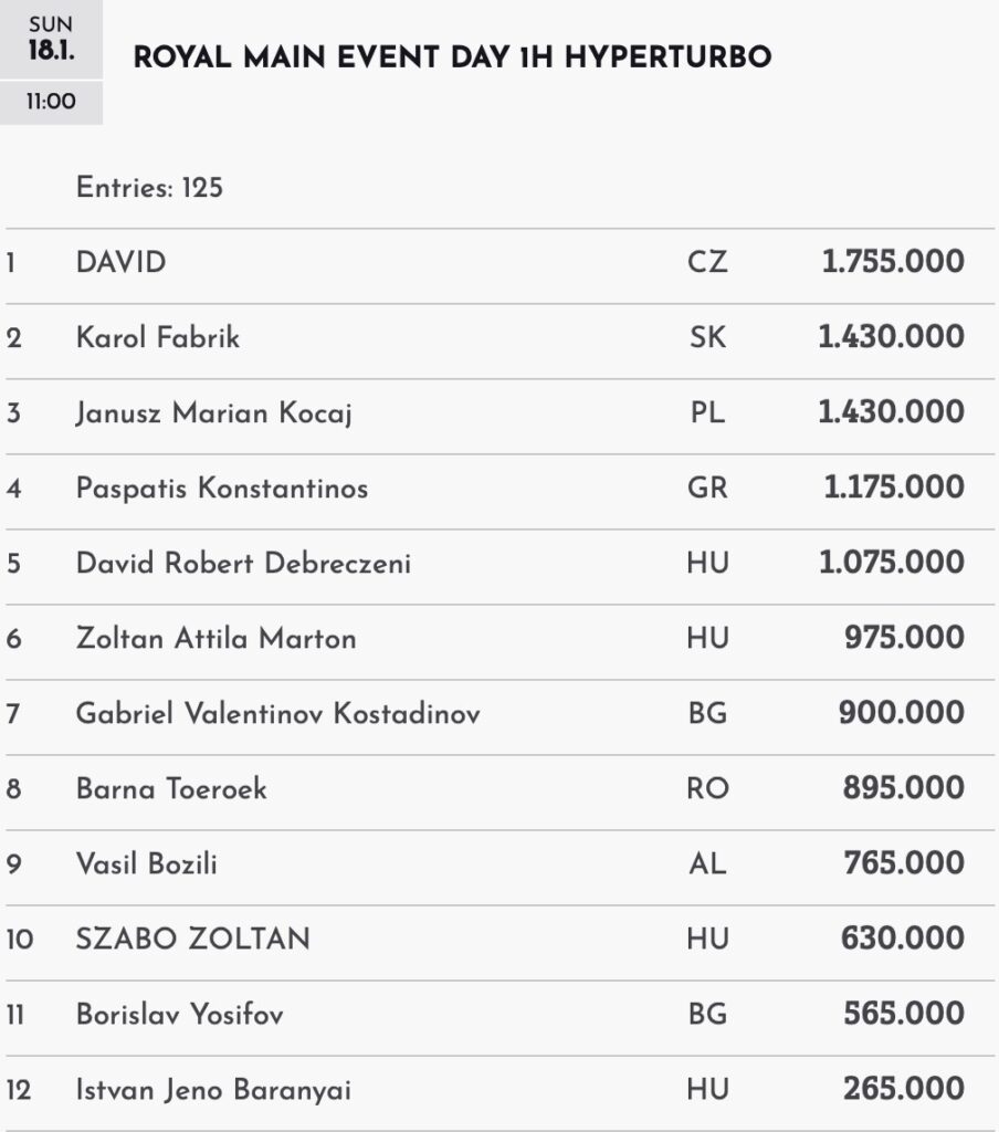 In den letzten vollwertigen Starttag gingen 125 Entrys, von denen 12 die turbomäßigen Blindlevel überstanden und sich Chips für den im Anschluss gespielten Tag 2 sicherten. Deutschsprachige Spieler*innen schafften im Tag 1H Hyperturbo den Cut nicht. Erfolgreichste Chipsammler aus diesem Flight waren Janusz Kocaj (POL) und Karol Fabrik (SVK) mit jeweils 1.430.000 Jetons, sowie der 1H-Chipleader „DAVID“ (CZE), der es auf 1.755.000 Jetons brachte.