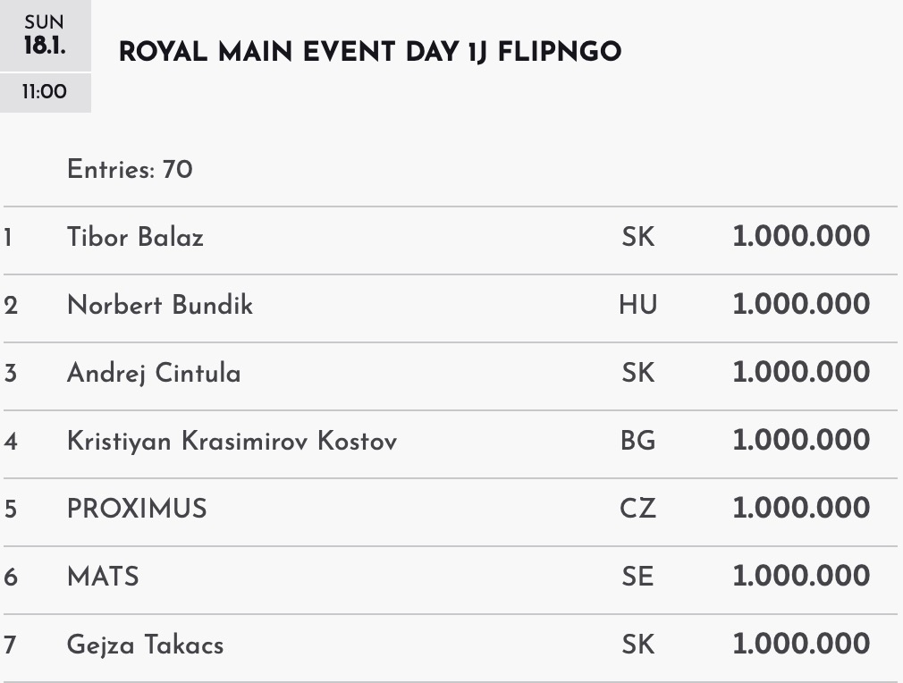 Eine Viertelmillion Euro sind auch bei der Januar-Ausgabe vom beliebten ROYAL Main Event im Card Casino Samorin garantiert. Darunter 9 Tickets zu je €1.500 für den WSOP Circuit im Card Casino SK. Um Payouts und Tickets konnte mit lediglich €200 Startgeld gespielt werden. Dafür erhielt man 100.000 Starting Chips und 30 Minuten Spielzeit pro Level (20 Minuten im Turbo, 12 Minuten im Hyperturbo). In insgesamt 10 Flights, davon 2 Flip and Gos, konnte man sich für Tag 2 (SO, 17:00 Uhr) des 3-Day-Events qualifizieren. Dort wurden die Blindlevel dann auf 40 Minuten verlängert, im Finale (MO, 16:00 Uhr) werden sie sogar 60 Minuten andauern.