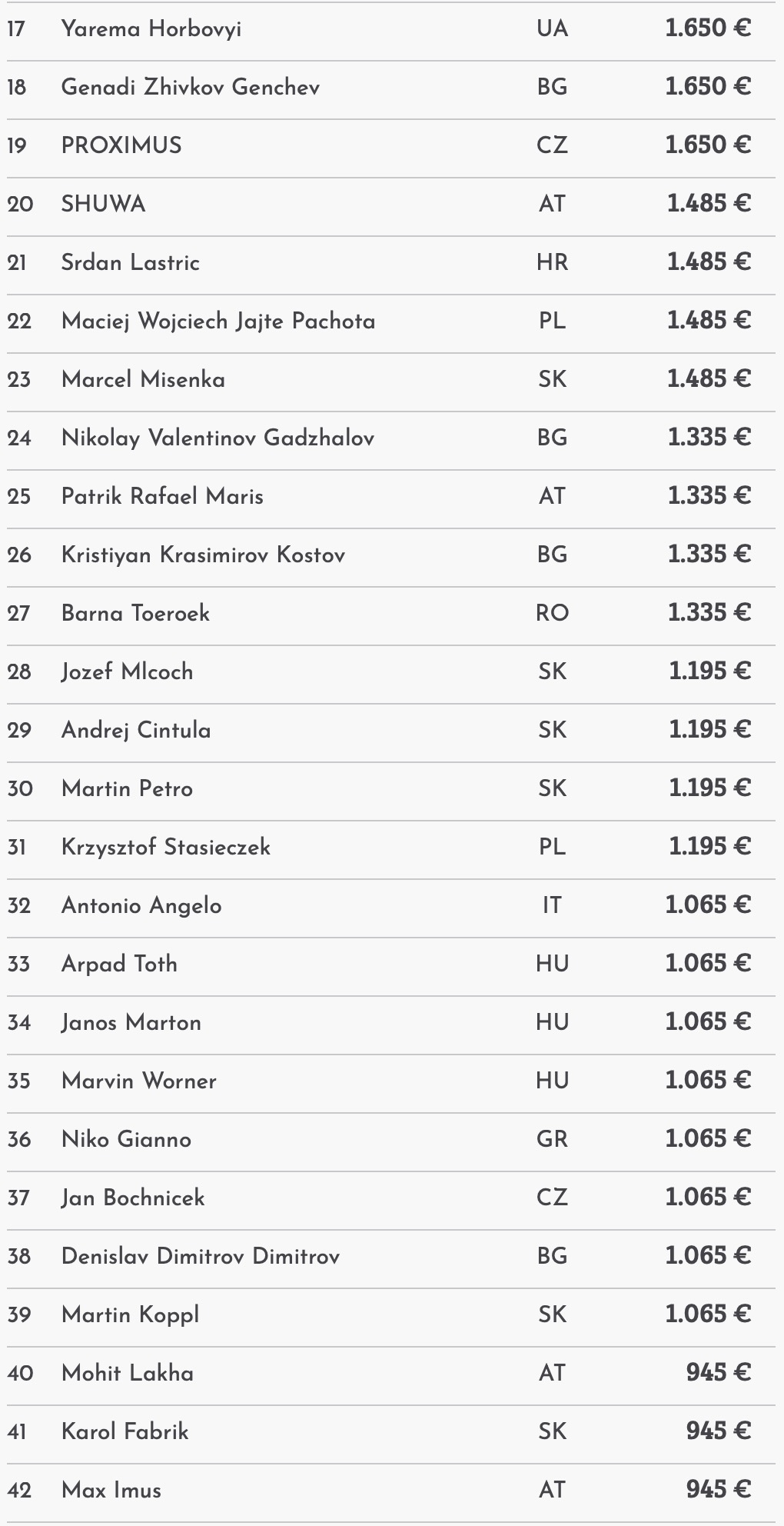 Die dicksten Payouts schnappten sich Attila Markovici (UKR) mit €3.097 auf Rang 4, der Drittplatzierte Stefan Koller (SVK) mit €2.982, Runner-Up „undefined Steved“ (CZE) mit €3.574 und der britische Sieger des ROYAL Mystery Bounty Events, Conan Nieto Hazard, der dafür €3.272 kassierte.