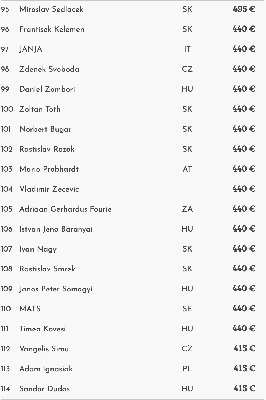 | Day 1C | 146 | 15 | Jan Bendik (SK): 2.255.000 |