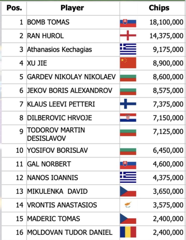 Auf dem Weg zum Final Table blieben leider alle 13 Spieler aus der D-A-CH-Region auf der Strecke. Als Bester von ihnen schloss „SHUWA“ das ROYAL Main Event auf Rang 20 mit €1.485 Payout ab. Die verbleibenden 16 Finalisten kommen aus 10 verschiedenen Nationen und werden heute ab 16:00 Uhr (ab 16:30 Uhr mit 30 Minuten Delay im Livestream) auf royale Titeljagd gehen. Hervorragende Voraussetzungen dafür haben sich Athanasios Kechagias aus Griechenland mit 9.175.000, Hurol Ran aus England mit beachtlichen 14.375.000 und der slowakische Tag-2-Chipleader Tomas Bomb mit einem 18.100.000 Monsterstack erspielt.