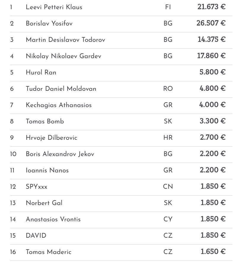 Stattdessen spielten sich drei Bulgaren und ein Finne in den Vordergrund. Kaum war Hurol Ran auf Platz 5 ausgeschieden, einigten sie sich auf einen Deal und spielten anschließend noch den offiziellen Turniersieger aus.