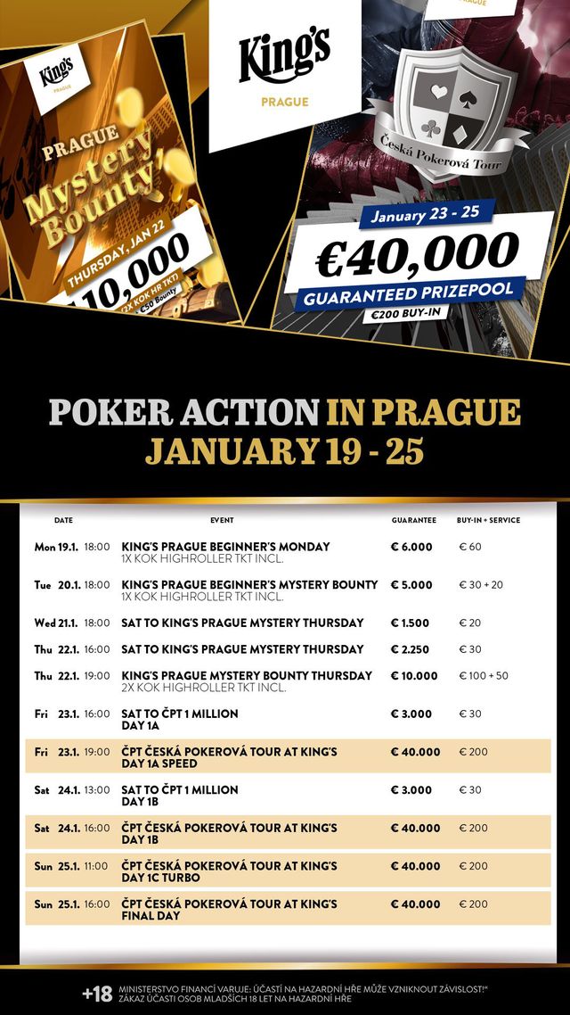 Insgesamt werden 7 Flights (1A bis 1G), sowie ein Flip and Go Pineapple ausgetragen. In jedem der Starttage erreichen die besten 15% die Preisgeldränge und haben damit bereits €500 Min-Cash auf ihrer King’s Card sicher. Nach der geplatzten Money Bubble wird dann ohne weiteres Hand-for-Hand-Play weitergespielt bis nur noch 12,5% der Flight-Teilnehmer*innen übrig sind, die dann ihre Chips für Tag 2 eintüten können. Für den Chiplead in jedem der regulären Flights gibt es außerdem €1.150 Chipleader Bonus in Form von King’s Main Event Tickets.