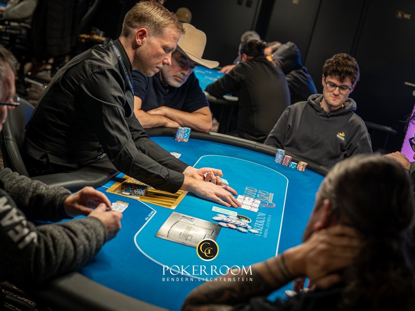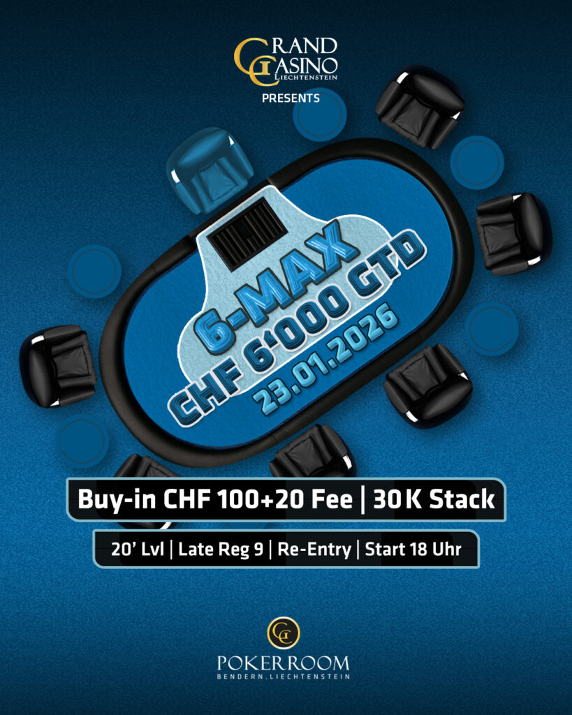 48 Spieler*innen ließen sich ab 18:00 Uhr das actionreiche 6-Max im GC Pokerroom Bendern nicht entgehen. Darin musste 16-Mal die Re-Entry-Option herhalten, was in dem Turnier mit 120-20 CHF Buy-In für 7.680 CHF im Preispool sorgte. Die 6k-Garantie wurde damit übertroffen und das Preisgeld sollte auf die Top-8 aufgeteilt werden, beginnend mit 300 CHF Mincash bis hin zur 2.300m CHF Siegprämie.