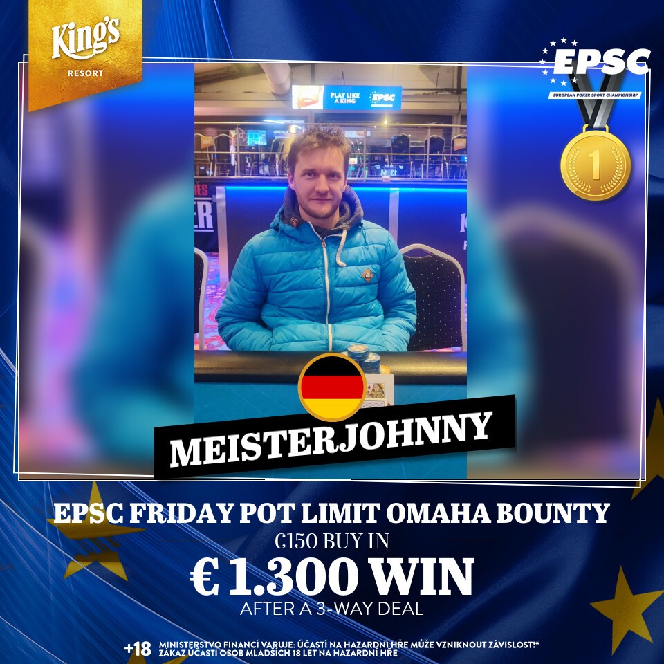 Denn das verbleibende Trio sollte sich auf einen nahezu Even Deal einigen, der „MeisterJohnny“ (GER) Rang 3 und €1.300 bescherte. Genauso viel erhielt Dauercasher Michal Mrakes (CZE) als Runner-Up. Über 50€ mehr und die Bragging Rights für den EPSC Friday Pot Limit Omaha Bounty Turniersieg konnte sich am Ende „Bela“ (GER) freuen. Zu den Payouts aus dem regulären Preispool wurden natürlich noch die eingesammelten und verteidigten Bountys ausgezahlt.