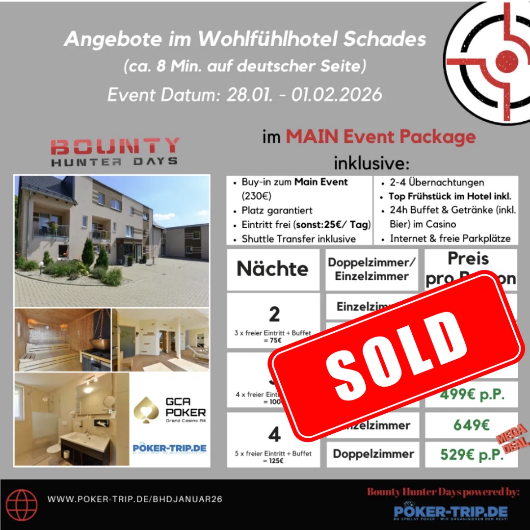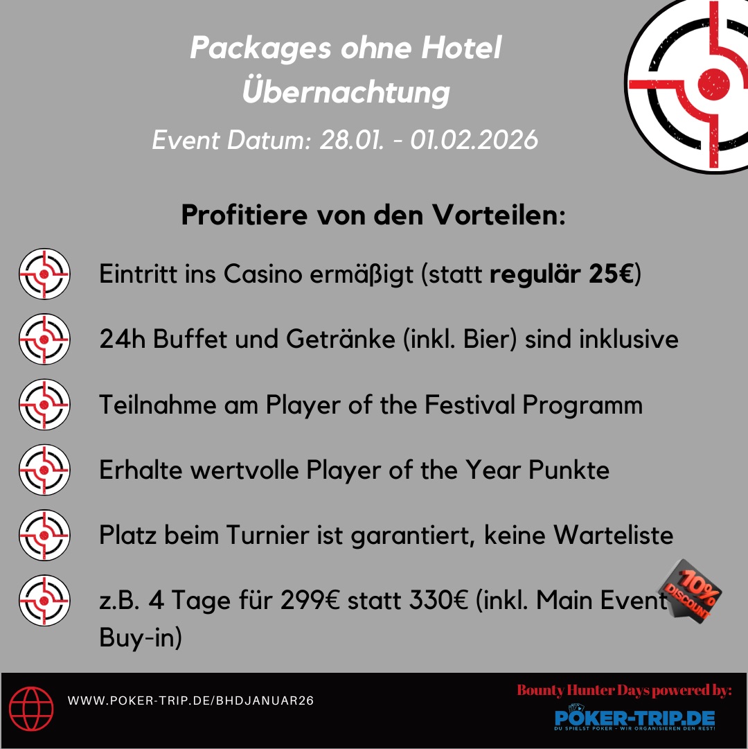 Zum festen Repertoire der Bounty Hunter Days gehört das Signature Turnier von Michael „Mayoman“ Strauch. Für das Highroller MTT wird man mit €400 Buy-In etwas tiefer in die Tasche greifen müssen. Wer das nicht aus dem Stand machen möchte, hat die Möglichkeit am Mittag des Starttages ein €70 Satellite dazu zu spielen, oder das Startgeld im Rahmen eines Poker-Trip-Pakets zu erwerben.