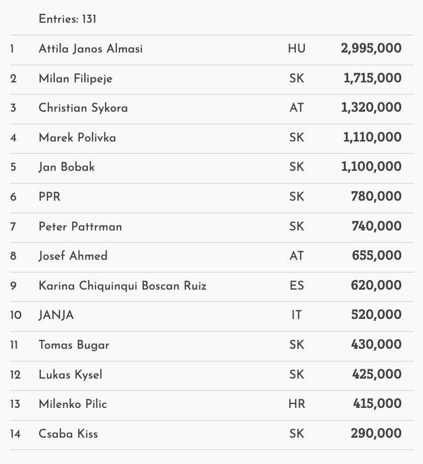Milan Filipeje aus der Slowakei reihte sich mit 1.715.000 Chips in zweiter Position ein.