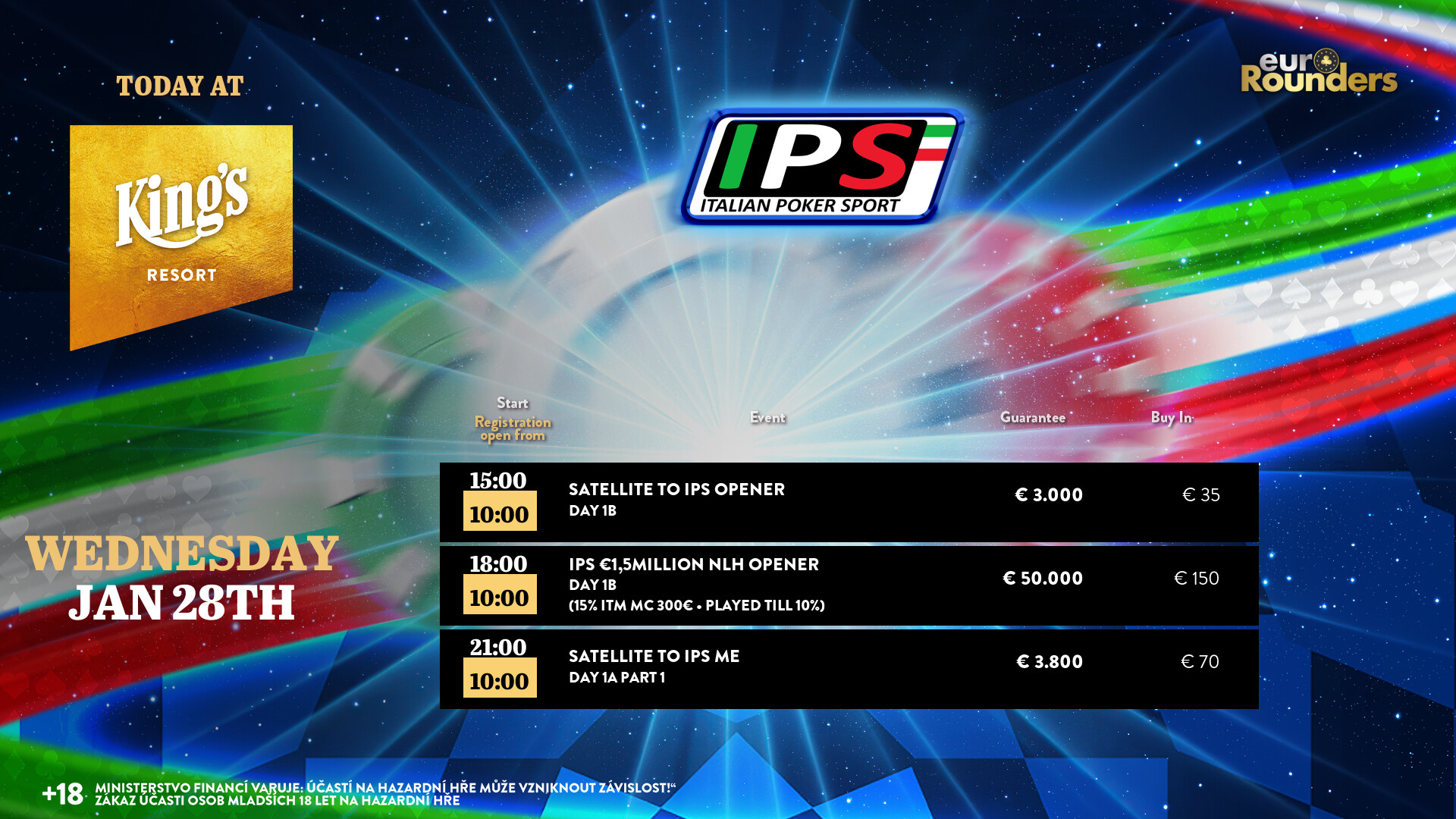Im King’s Resort startete gestern das Italian Poker Sport (IPS) powered by EuroRounders mit dem €150 NLH Opener! Im King’s Casino Prag wurde ein zweiter Flight des 1 Million Crown Series gespielt.