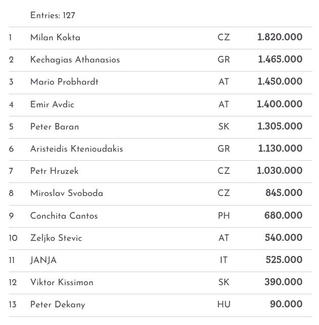 1C | 128 | 13 | Zoltan Istvan Kovacs (HU): 2.505.000 |