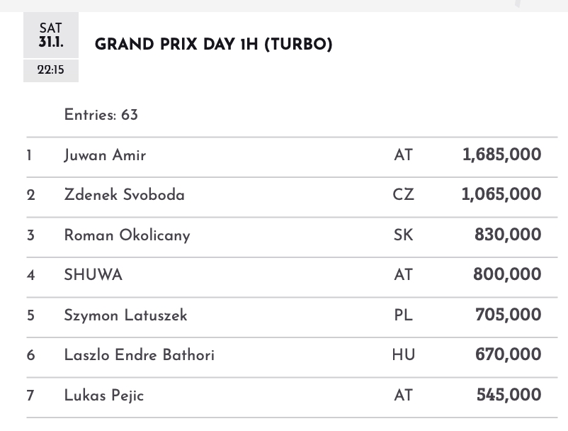 | 1H – Turbo | 63 | 7 | Juwan Amir (AT): 1.685.000 |