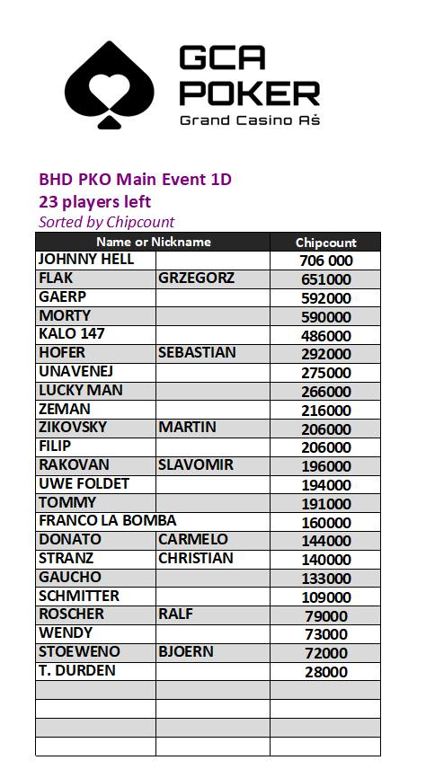 Name or Nickname Chipcount OSTI22LS 1 249 000 DIV1NE PLAYER 534 000 WAGNER STEFAN 513 000 DE PAELZER 496 000 BIRTY BONES 475 000 HERR VIKTOR 389 000 MAGGUS 379 000 DR. HABIBI 361 000 HENCK 338 000 HOFMANN HANNS 323 000 MINNIE MOUSE 319 000 HAT BANGER 311 000 ALAMI 309 000 THAMMSHI 304 000 ZHURAVLYOVOVA TETYANA 296 000 RADWAN SABINE 294 000 KELLER MARCO 280 000 TRISH 240 000 MAC 238 000 SPEER UWE 223 000 CALL OF DUTY 190 000 ALEX B. 188 000 DOURADO JACINTO 171 000 PATERA RADEK 161 000 Benny 148 000 SPRINGER PETER 141 000 CPT. JACK SPARROW 140 000 MUAD’DIB 139 000 BOSS 137 000 MUELLER JOERG 118 000 DIRKO 117 000 MAINHATTAN 108 000 OLLI77 102 000 BRAEUTIGAM MICHAEL 97 000 GEIER RAIMUND 93 000 USCHNER RONNY 50 000 TRAINEE 48 000 SCHMITTPIT 31 000