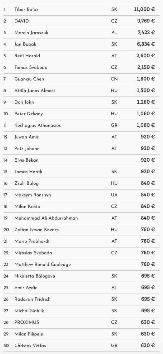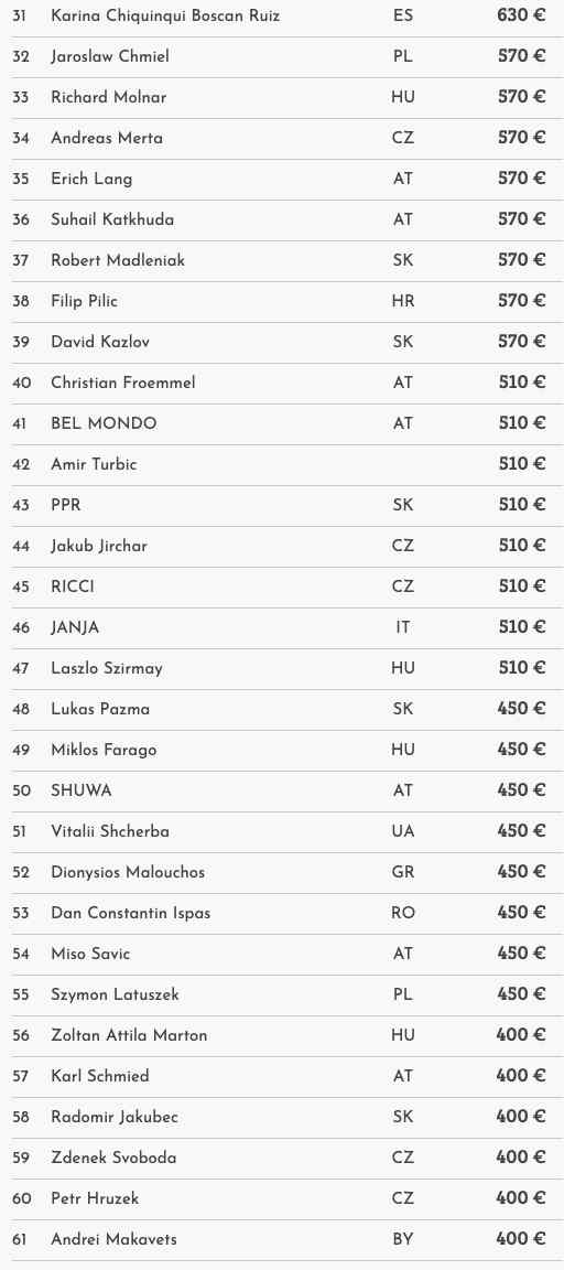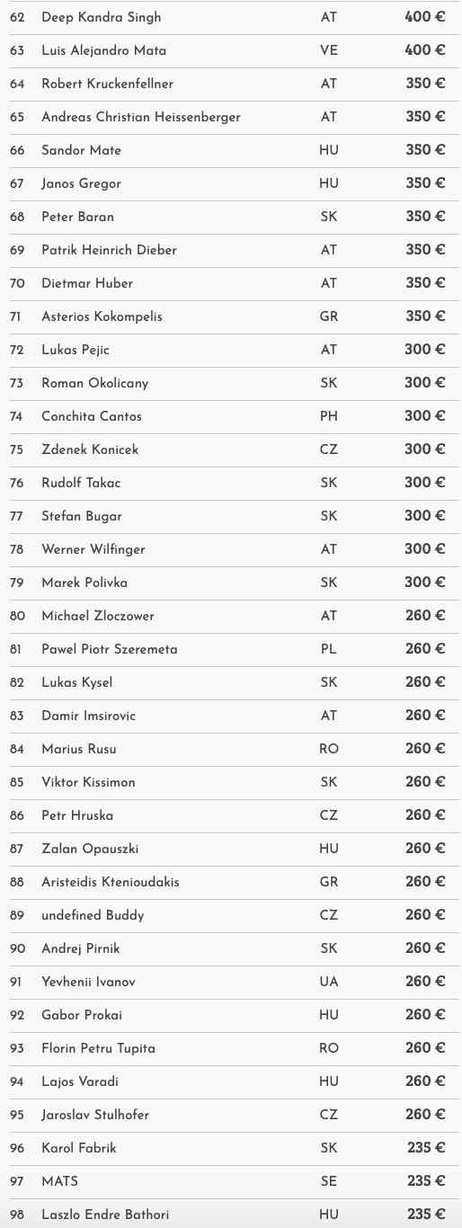 Einige DACH-Spieler schafften es auf vordere Ränge. Unter anderem Ali Abdurrahman Muhhamad (AT – Platz 19, €840), Johann Petz (Platz 13, AT – €920), Amir Juwan (Platz 12, AT – €920) und Harald Redl (Platz 5, AT – €2.600).