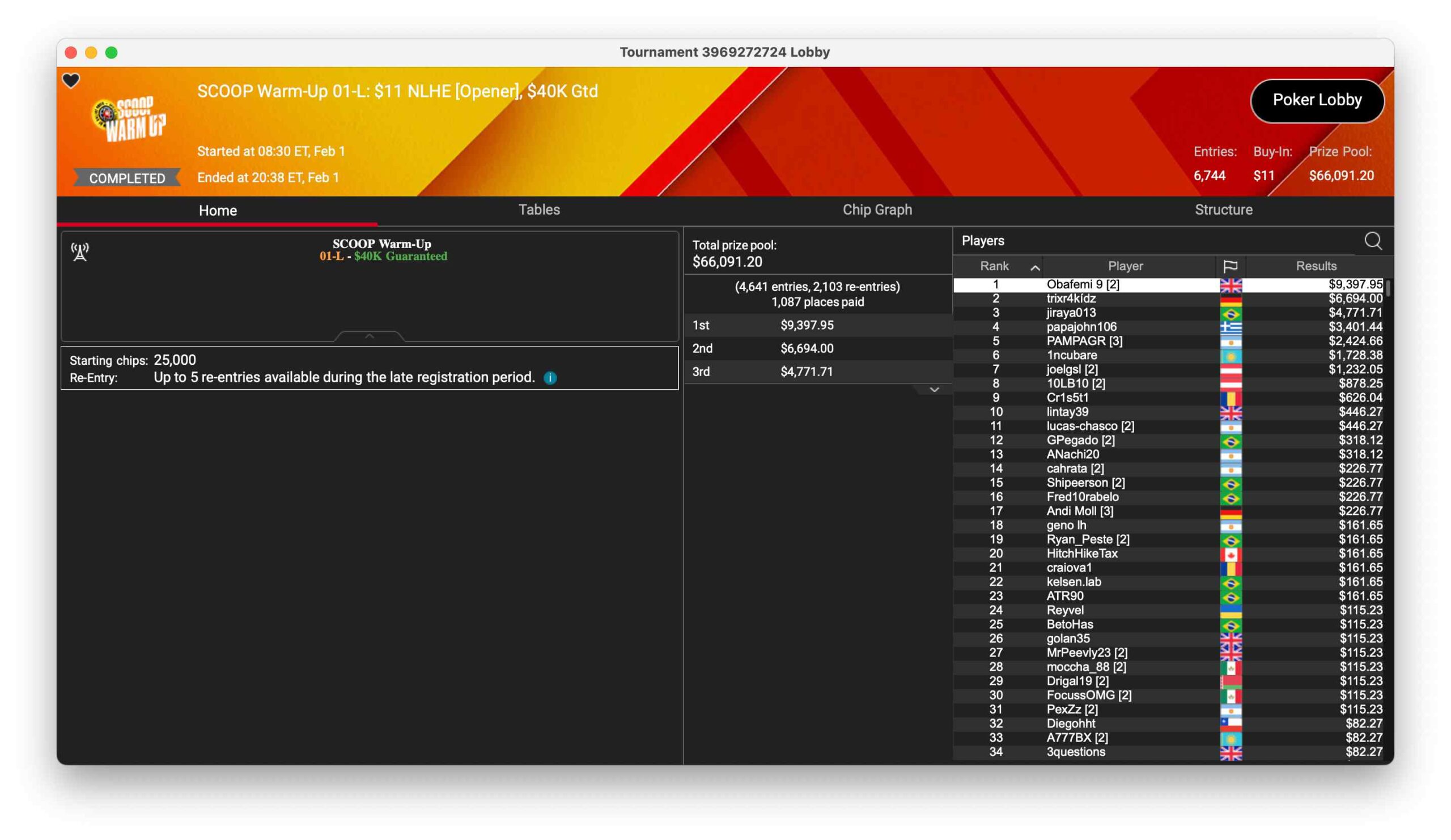Das SCOOP Warm Up $11 PLO 6max hatte 1.841 Entries und einen $18.041 Preispool. „superslide“ aus Deutschland holten den Sieg und $1.115 + $1.133.