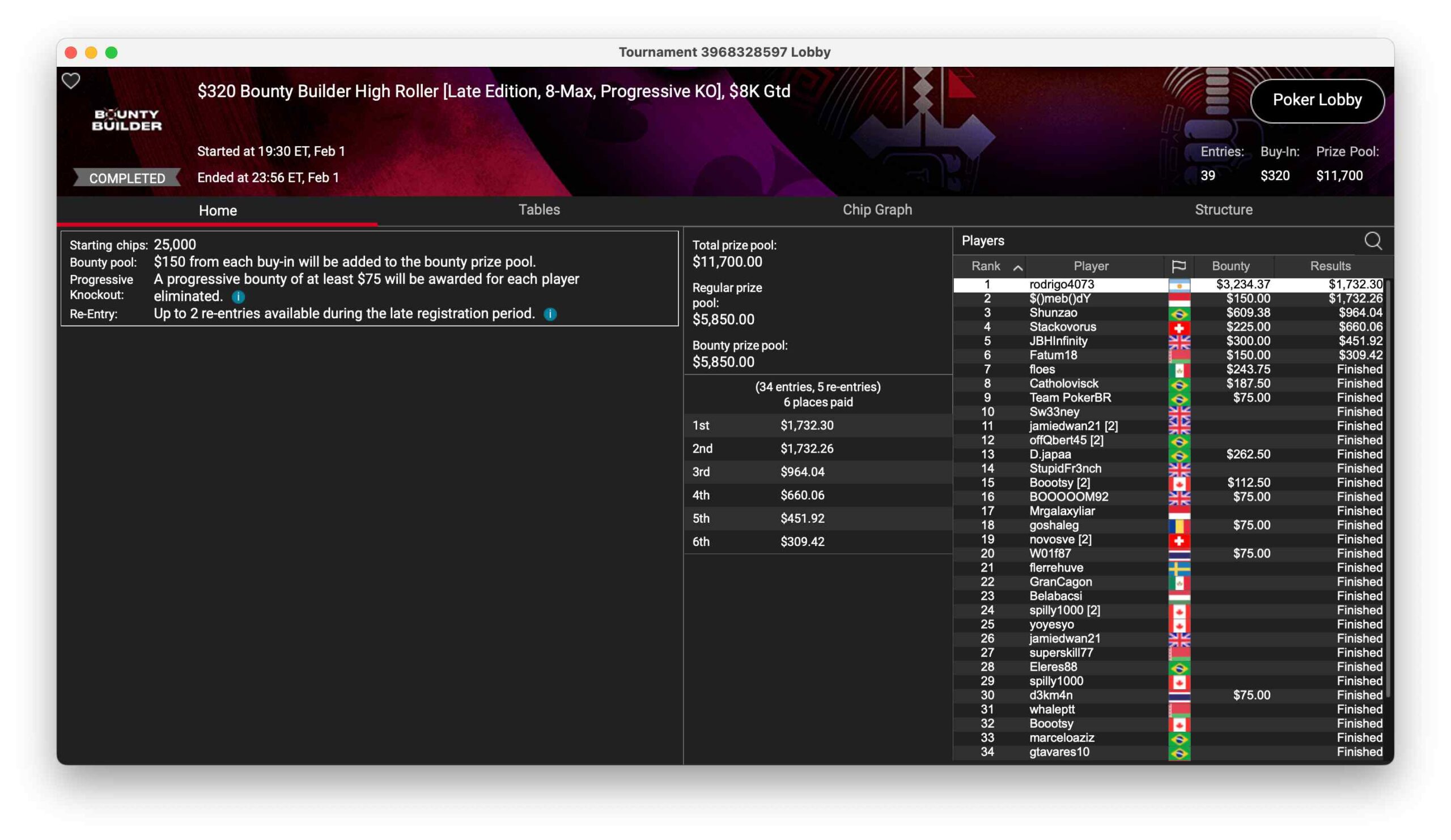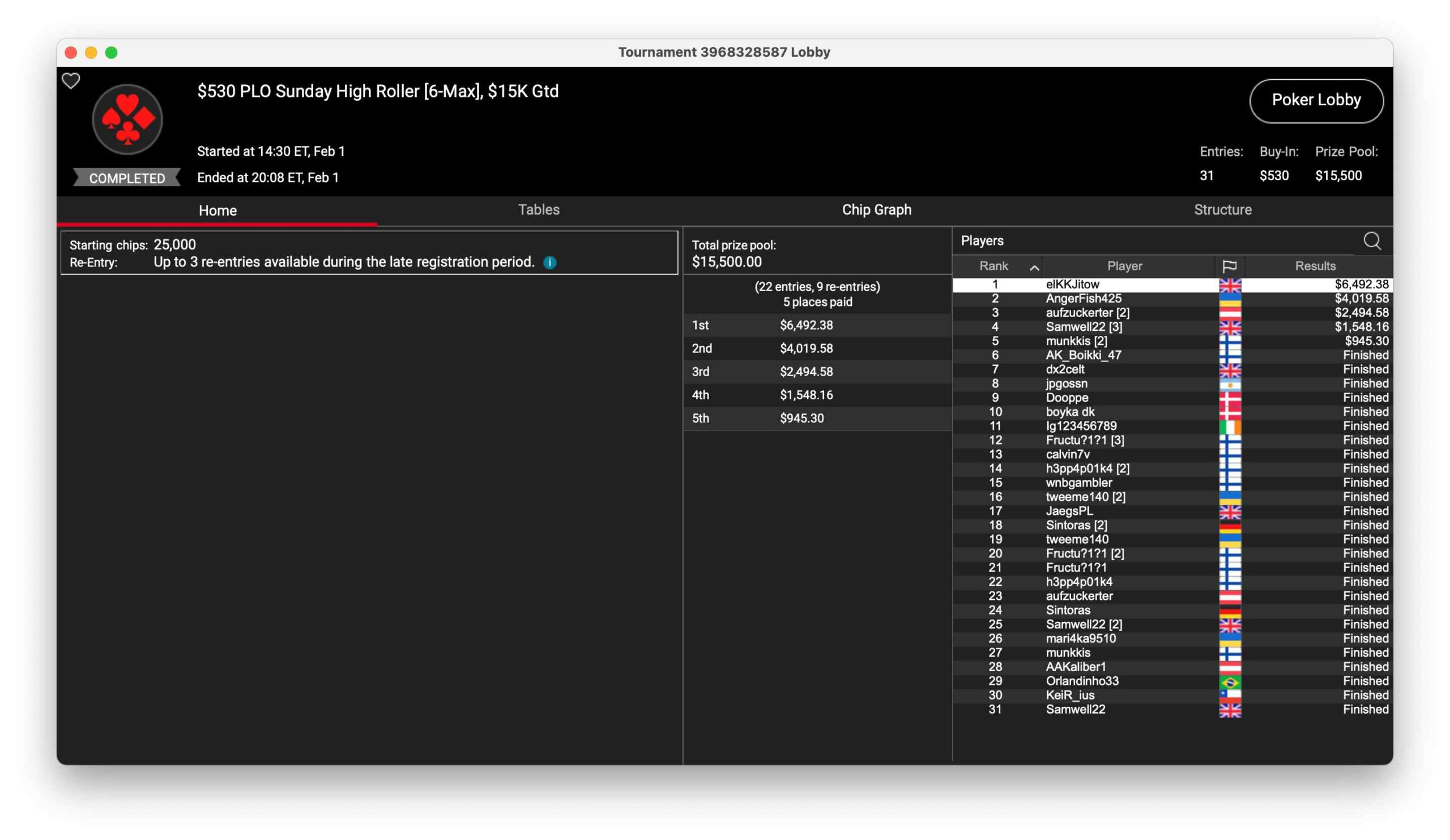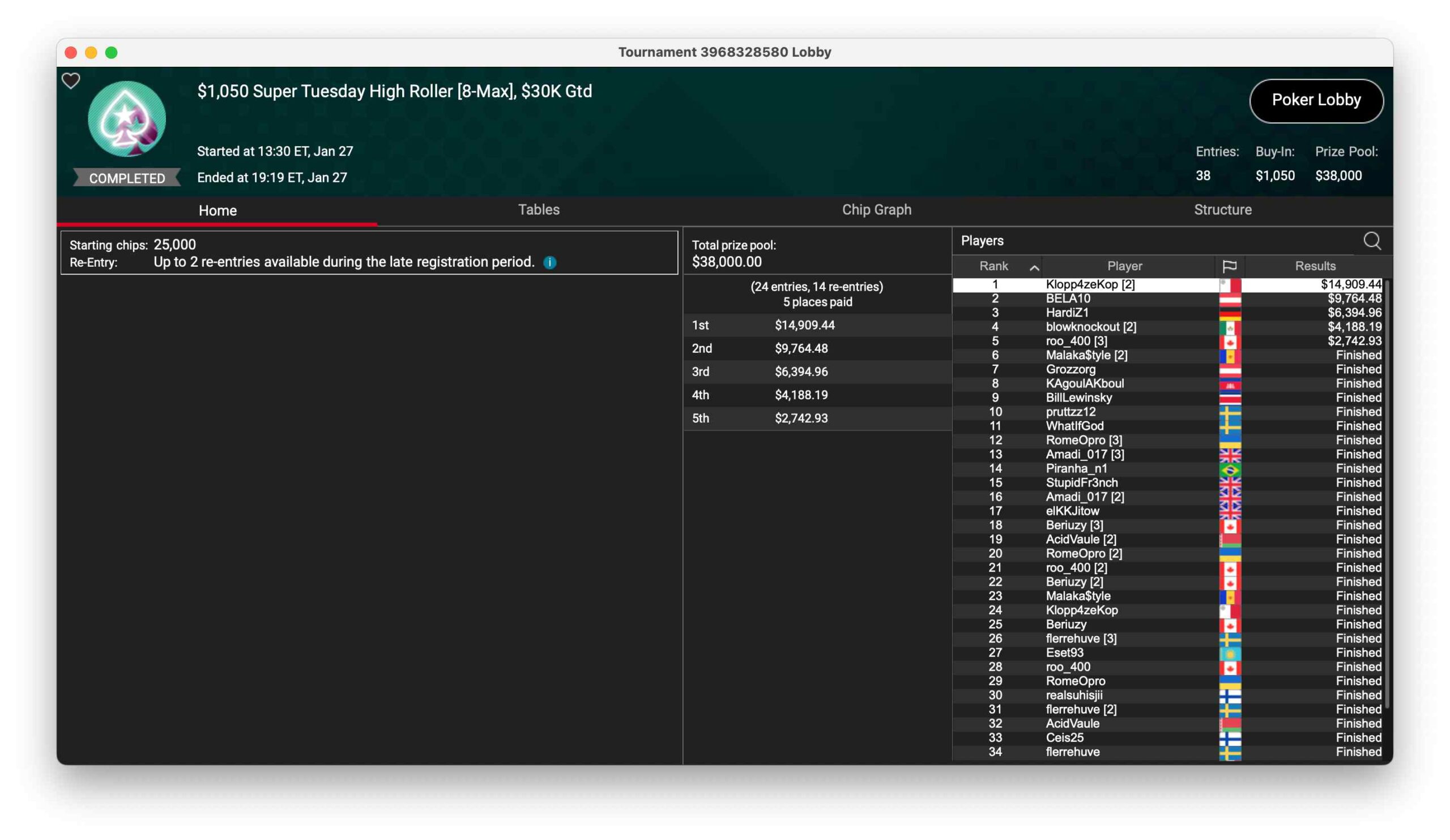 Im $1.050 Super Tuesday wurde sich 38 Mal eingekauft – $38.000 wurden über die 5 bezahlten Plätze neu verteilt. „Klopp4zeKop“ gewann für $14.909. „BELA10“ aus Österreich (Platz 2, $9.764) und „HardiZ1“ aus Deutschland (Platz 3, $6.394) platzierten sich im Geld.
