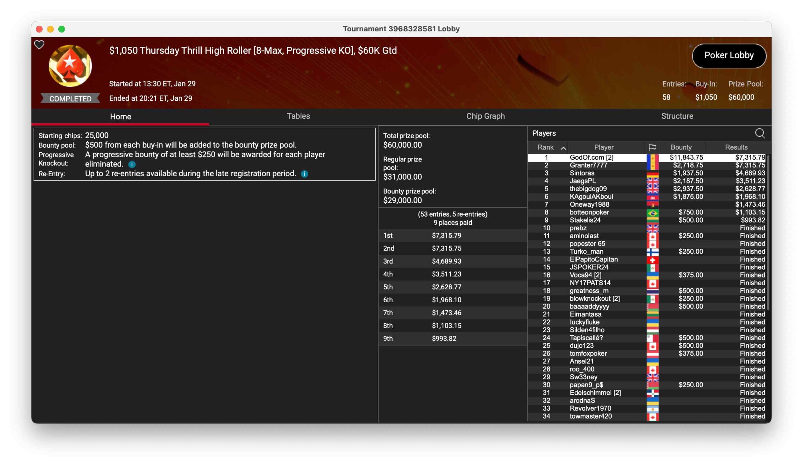 Das $1.050 Thursday Thrill High Roller hatte 48 Entries und aus der Garantie $60.000 neu verteilt. „GodOf.com“ aus Rumänien gewann für $11.843 + $7.315. „Sintoras“ aus Deutschland wurde Dritter für $1.937 + $4.689.