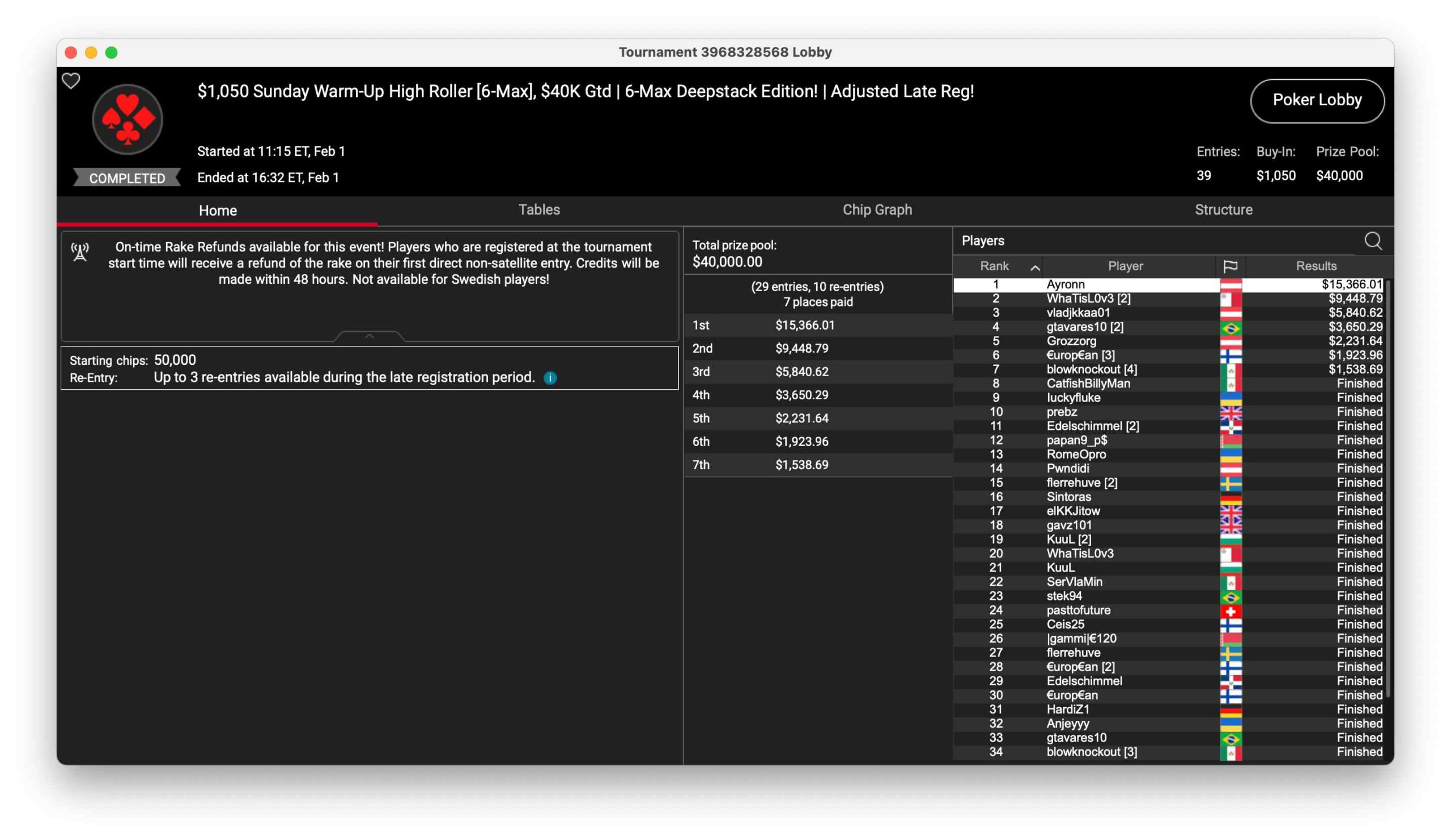 Im $1.050 Sunday Warm Up mit 39 Entries und $40.000 Preispool aus der Garantie konnte sich der Österreicher „Ayronn“ durchsetzen, der auf Platz 1 mit $15.366 aus dem Turnier ging. Leonad „Grozzorg“ Maue nahm auf Platz 5 €2.231 mit.