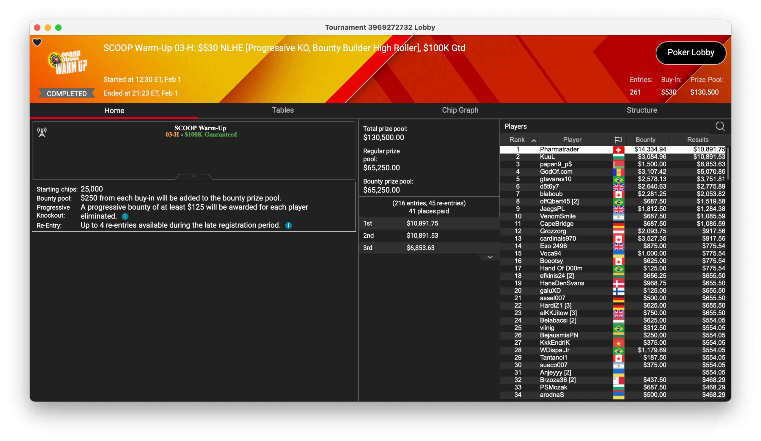 Der Schweizer „Pharmatrader“ gewann das $530 NLHE PKO Bounty Builder HR mit 261 Entries und $130.500 Preispool. $13.334 + $10.891 gab es für den Sieg.