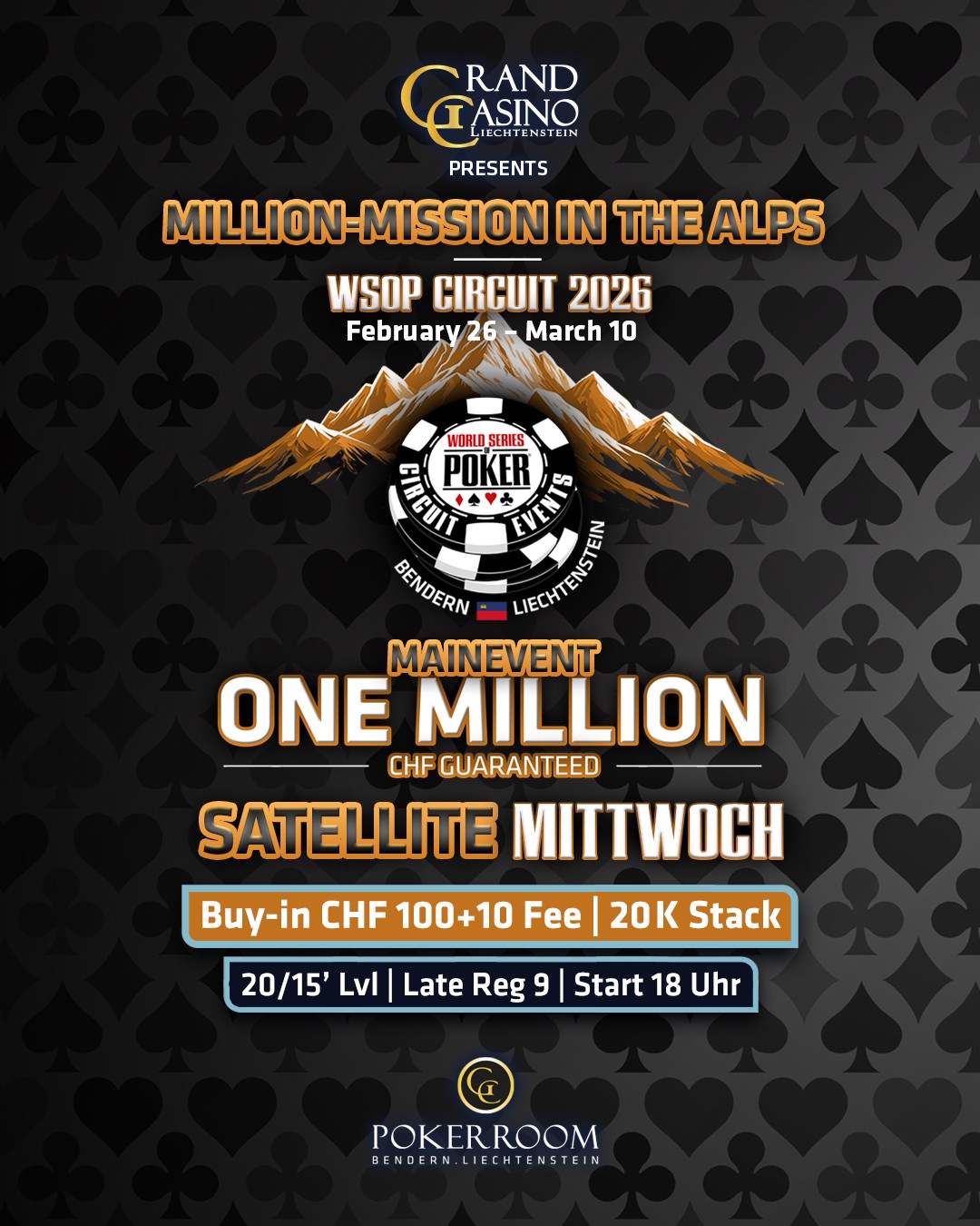 Heute steht im Grand Casino Liechtenstein das CHF 100+10 WSOPC Satellite auf dem Programm – 20/15 Minuten Level werden hier gespielt, Late-Reg ist offen bis in Level 9. Alle Spieler bekommen zum Start 20.000 Chips, um 18:00 Uhr geht die Jagd auf die CHF 1.500 Tickets los.