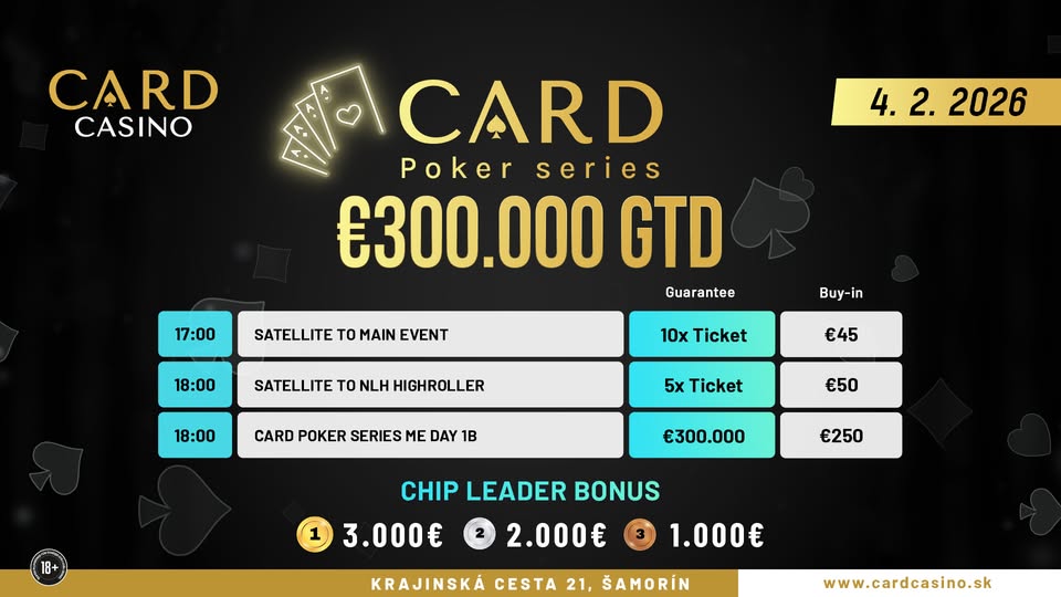 Am Dienstag fiel der Startschuss zur €300.000 gtd. Card Poker Series im Card Casino Samorin (vormals Card Casino Bratislava). Am ersten von zehn Starttagen wurden nicht nur 18 Spots für Tag 2 vergeben, sondern auch bereits €6.000 an Chipleader-Boni für die Top 3. In dem internationalen Starterfeld sollten auch zwei Österreicher Day 1A erfolgreich beenden.