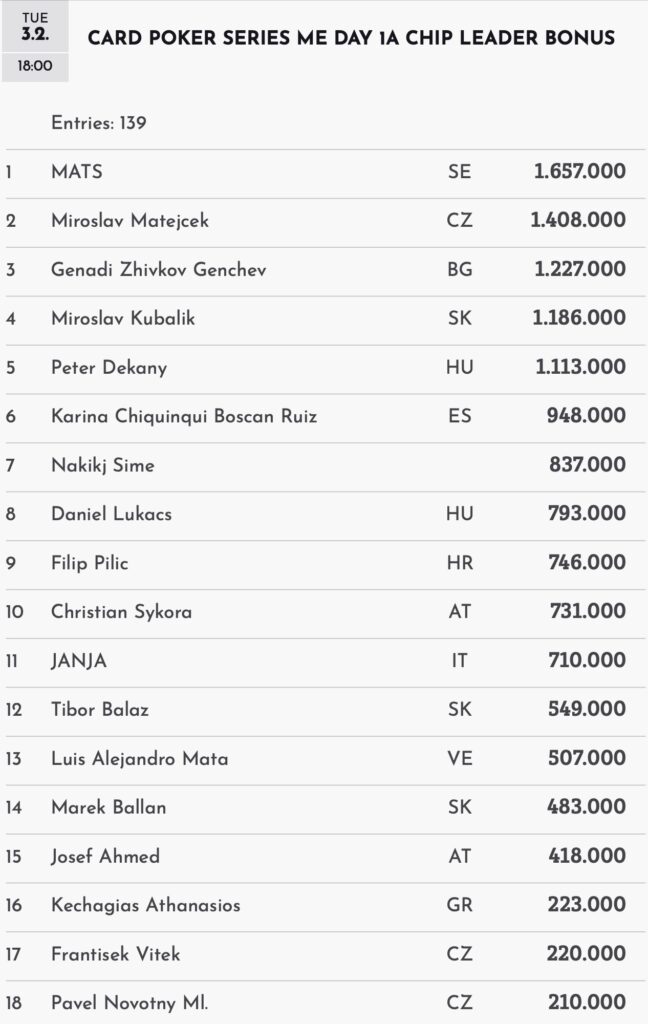Ganz vorne machten jedoch andere die Boni unter sich aus. Genadi Genchev (BUL) konnte sich mit erspileten 1.227.000 Jetons nicht nur über eine gute Ausgangslage für Tag 2, sondern auch über €1.000 Chipleader Bonus freuen. €2.000 wurden es bei Miroslav Matejcek (CZE), der einen 1.408.000er Stack in seine Chiptüte packen konnte. Erster Chipleader der Card Poker Series wurde am Dienstagabend „MATS“ aus Schweden, die mit eingetüteten 1.657.000 Jetons und €3.000 Chipleader Bonus übernachten konnte.