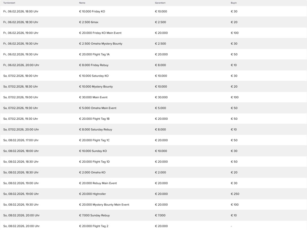 Die Main Events finden nicht alle parallel statt. Vielmehr gibt es bei der Winter Poker Series mindestens ein Main Event pro Tag. Den Anfang macht am Freitag um 19:00 Uhr das €20.000 Friday KO Main Event, für das das Buy-In bei €100 liegt. Das Main Event zur Prime Time um 19:00 Uhr am Samstagabend ist das €30.000 Main Event. Für €100 Startgeld ist man dabei. Nur eine halbe Stunde später startet um 19:30 Uhr das €5.000 Omaha Main Event mit €50 Buy-In. Und auch am Sonntag finden Hauptturniere statt. Um 19:00 Uhr beginnt das €20.000 Rebuy Main Event. €30 beträgt hier das Geld für den Start und natürlich auch für ein mögliches Rebuy. Um 19:30 Uhr findet dann noch das €20.000 Mystery Bounty Main Event statt, in dem man für €100 auf Preisgeld- und Kopfgeldjagd gehen kann.