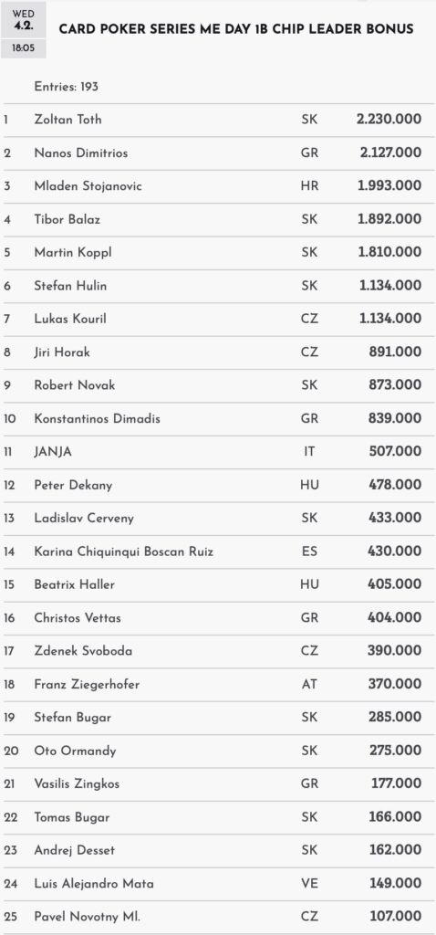 193 Entrys sorgten an zweiten der zehn Starttage für ein volles Haus im Card Casino Samorin. Ziel der Teilnehmer*innen war neben der Chiptüte für Tag 2 auch eine Platzierung unter den Top-3, die mit insgesamt €6.000 Chipleader Bonus vergütete wurde. Im Kampf darum ging es durchaus knapp zu. Mit beeindruckenden Stacks in Höhe von 1.810.000 und 1.892.000 Chips verpassten die Slowaken Martin Kopple und Tibor Balasz die Boni nur knapp. Die €1.000 für den dritten Platz im Chipcount gingen an Mladen Stohjanovic. Der Kroate brachte es auf 1.993.000 Jetons. Aus der Nanos-Familie war es am Mittwoch Dimitrios Nanos, der als Tageszweiter nicht nur mit 2.127.000 Jetons in Tag 2 geht, sondern dafür bereits €2.000 kassierte. Der Chiplead war jedoch Zoltan Toth nicht zu nehmen. Der Local Hero aus der Slowakei konnte sich über 2.230.000 erspielte Jetons und €3.000 Bonus freuen.