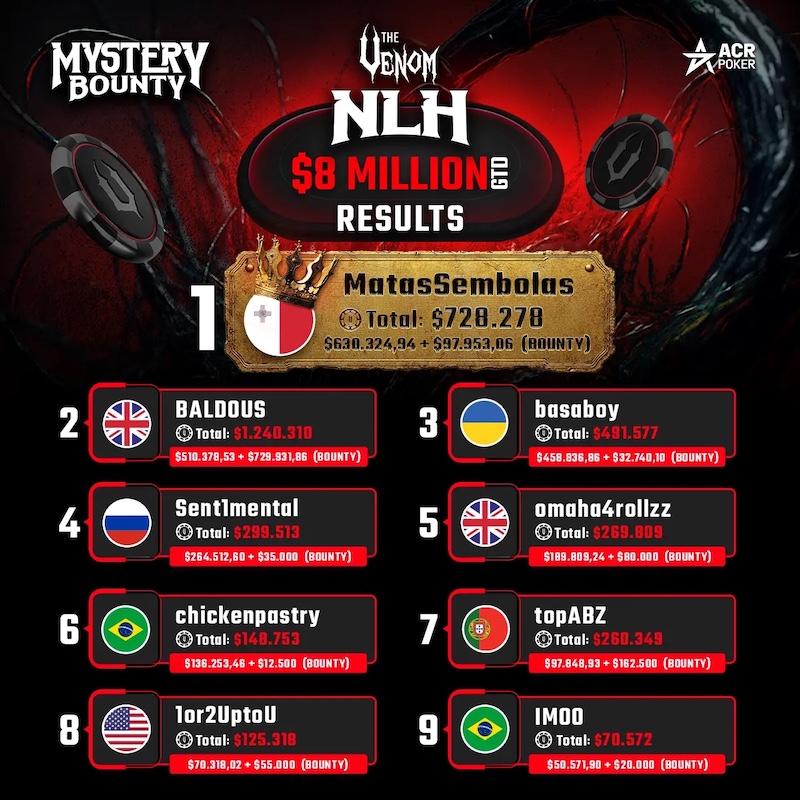 Das Legendäre „The Venom Mystery Bounty“-Turnier auf Americas Card Room (ACR) Poker endete gestern mit einem spektakulären Resultat: Ein Finalist heimste mehr als $1,2 Millionen ein und war nicht mal der Sieger des Turniers.
