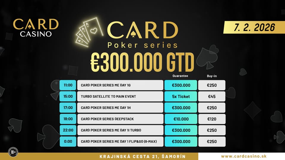 Erstmalig werden auch Online-Qualifikationen für das Card Poker Series Main Event angeboten, die täglich um 17:00 und 20:00 Uhr für slowakische Spieler*innen und um 19:30 Uhr für Spieler*innen in Tschechien auf synortip Poker angeboten werden.