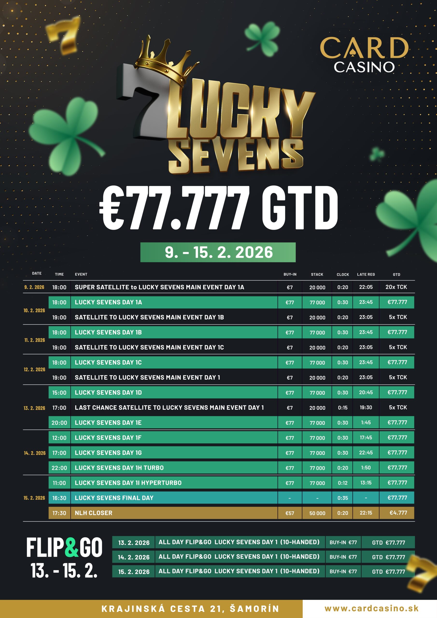 Für ein Startgeld von €77 werden bei diesem Turnier €77.777 an Preisgeldern garantiert und insgesamt neun Starttage plus Flip & Gos angeboten.