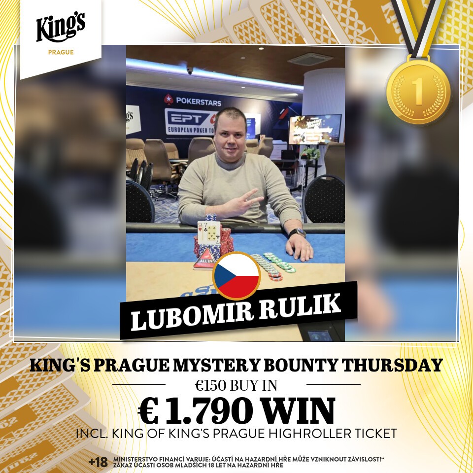 Im King’s Casino Prag lockte das Thursday Mystery Bounty mit einem Startgeld von €100+50 immerhin 62 (43+19) Entrys an.
