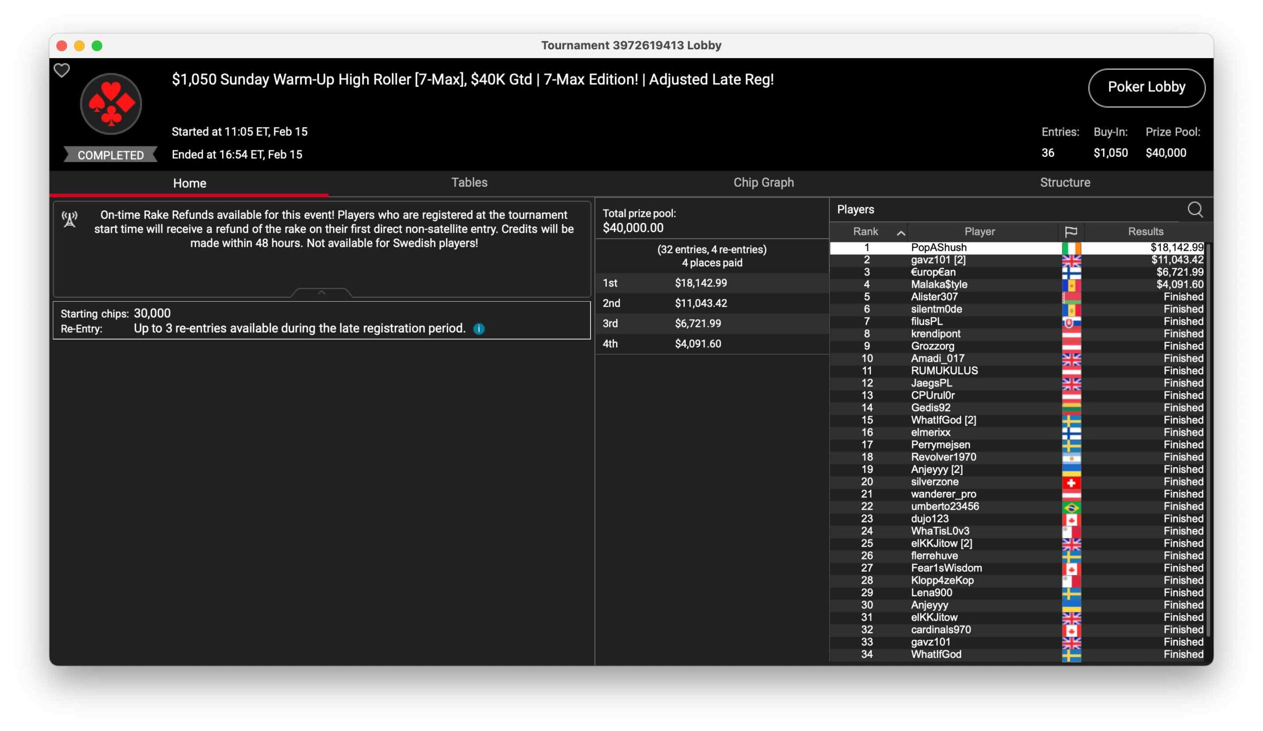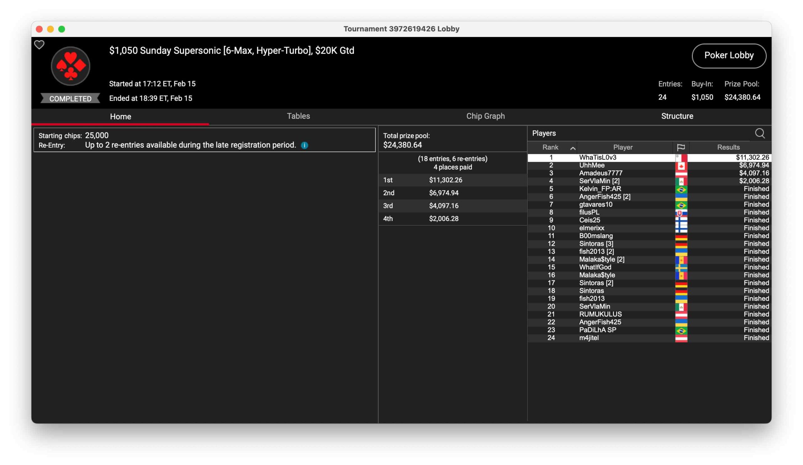 Enrico „WhaTisL0v3“ Camosci schnappte sich das $1.050 Sunday Supersonic. 24 Entries waren im Turnier dabei, $24.380 blieben im Preispool. $11.302 gab es für Platz 1. Österreicher „Amadeus7777“ wurde Dritter für $4.097.