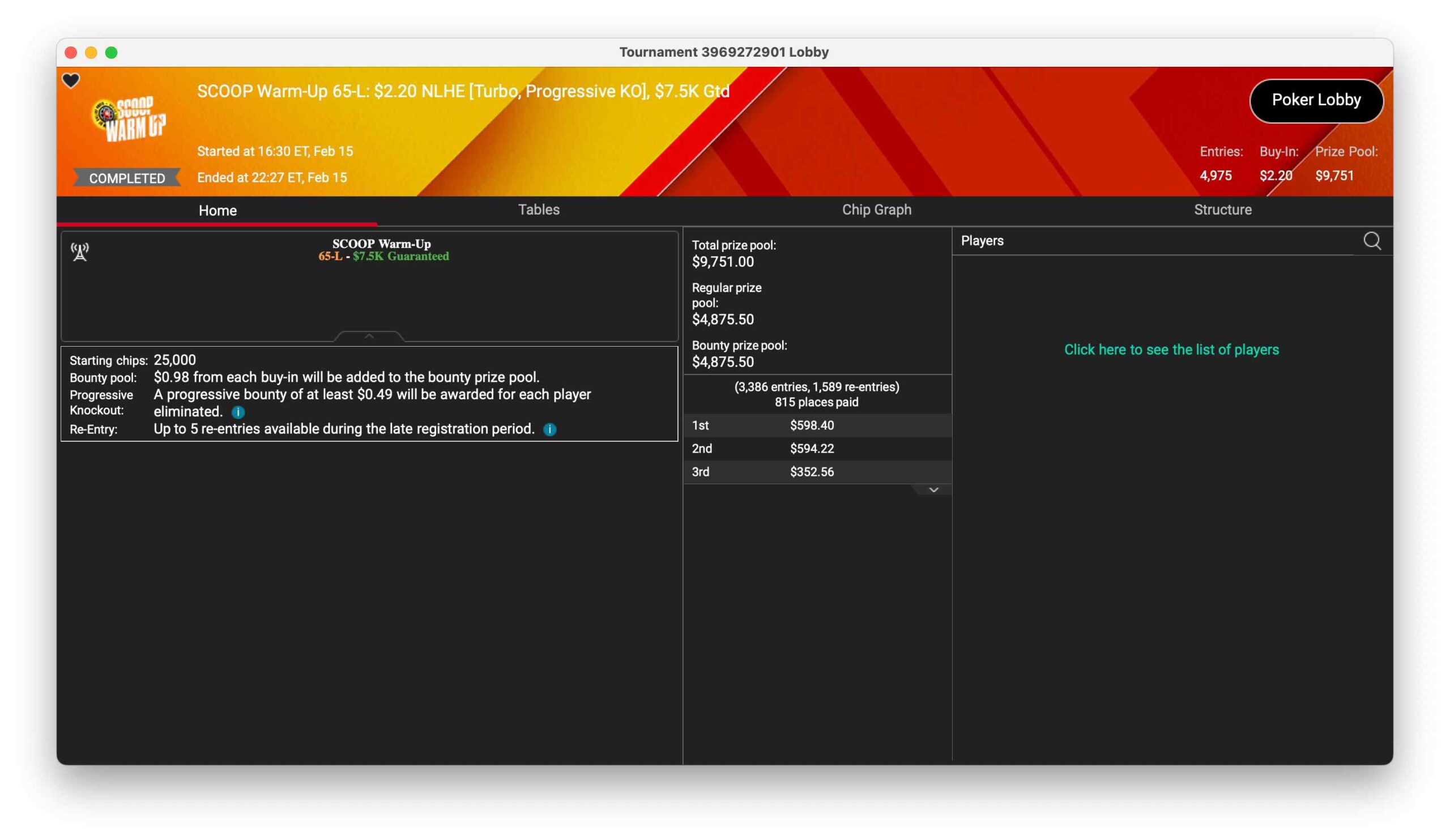 | 14. Feb | Sa | 12:30 | SCOOP Warm-Up 54-M: $55 NLHE [Progressive][KO,][Mini][Bounty][Builder][HR], $100K Gtd |