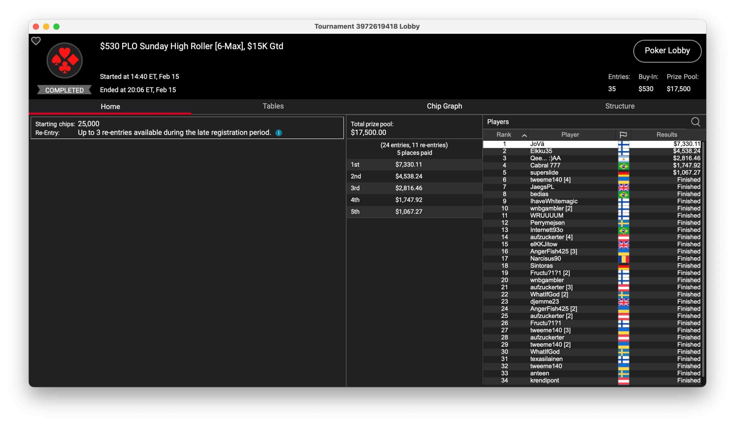 Ein deutscher Kopf konnte einen Sieg holen. Der PokerStars-Streamer Sebastian „peace&loove“ Huber gewann das Turnier 60-L, $22 NLHE PKO, mit 8.563 Entries. $171.260 kamen im Preispool zusammen. Der Sieg brachte Huber $5.444 + $10.298 an Bounties ein.