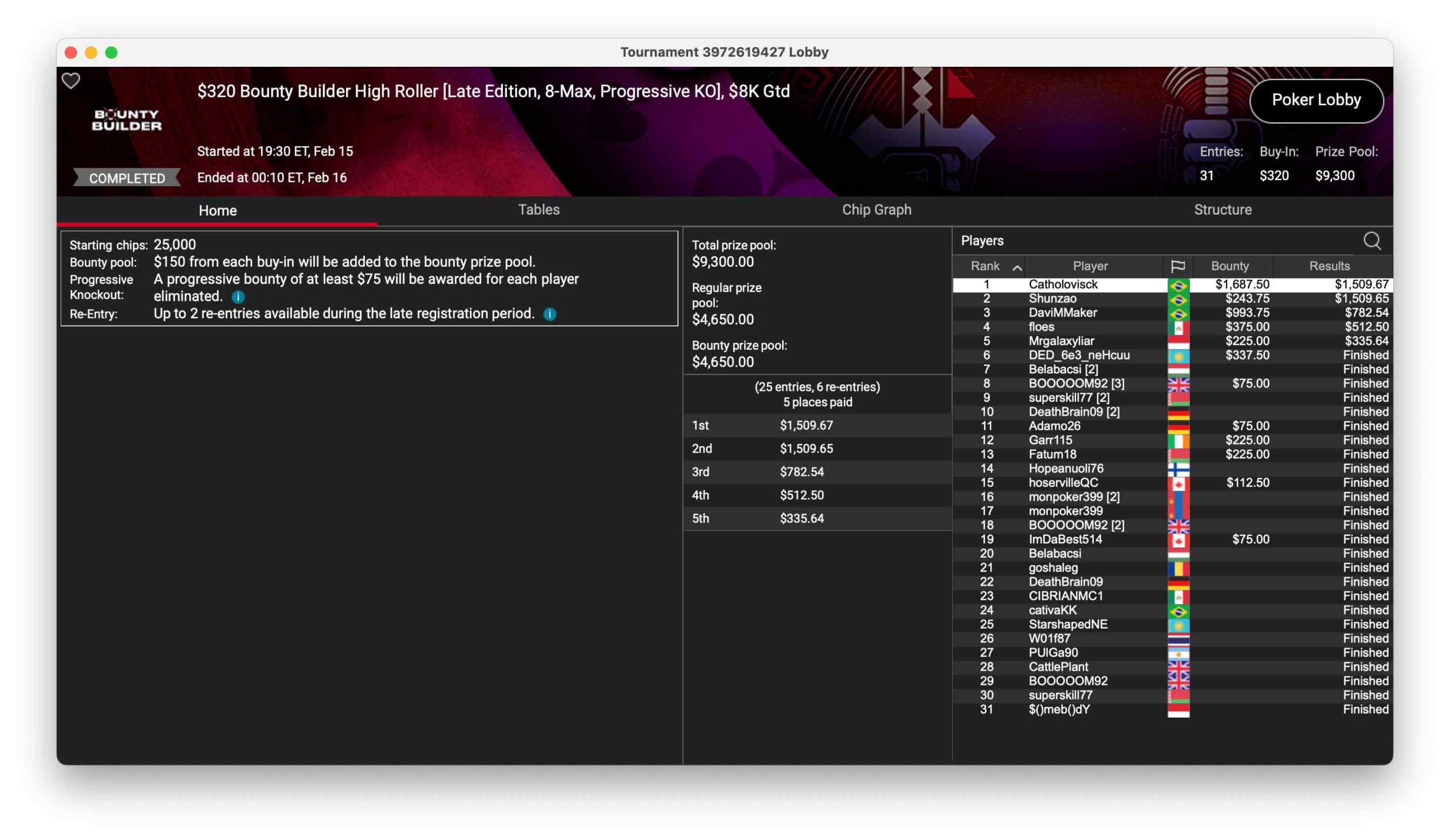 Schweizer waren auch im 61-H, ein $530 NLHE PKO Bounty Builder HR, erfolgreich. „silverzone“ (Platz 2, $5.093 + $10.265) und „florianlefou17″ (Platz 3, $125 + $6.495) waren auf dem Treppchen. „JBHInfinity“ aus Großbritannien gewann für $12.585 + $10.265.