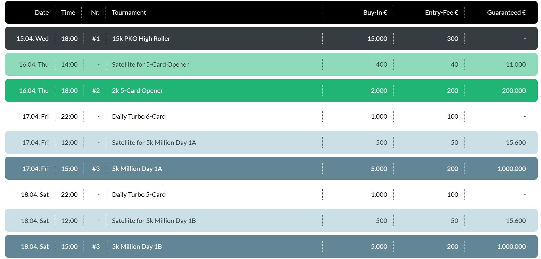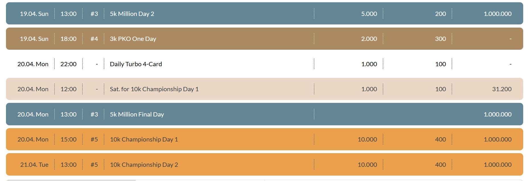 Los geht es am 15. April allerdings mit dem €15k PKO High Roller, und am Tag darauf sind die 5-Card PLO-Fans mit einem 2k-Opener dran. Parallel zur 5k Million wird am Sonntag, den 18. April das 3k PKO One Day angeboten. Mit sechs Karten wird dann am Dienstag, den 20. April, beim 2k 6-Card.