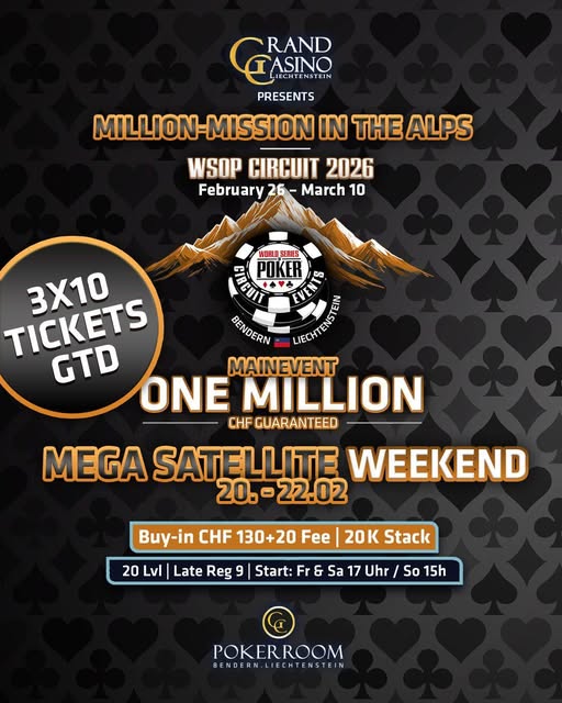 Am Freitag fiel der Startschuss zum Mega Satellite Weekend im Grand Casino Liechtenstein (GCLI). Beim ersten der drei identischen Turniere wurde der garantierte Preispool geknackt und zu den 10 WSOP Circuit Tickets gab es noch Cash für die besten Teilnehmer*innen. Unter den Qualifikant*innen für das WSOPC Liechtenstein Main Event (26. Februar – 10. März) waren auch bestens über den GC Pokerroom hinaus bekannte Namen.