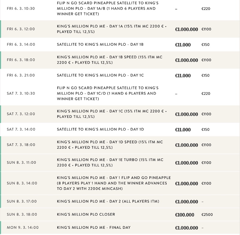 Hier der komplette Spielplan für das King’s Million PLO Festival:
