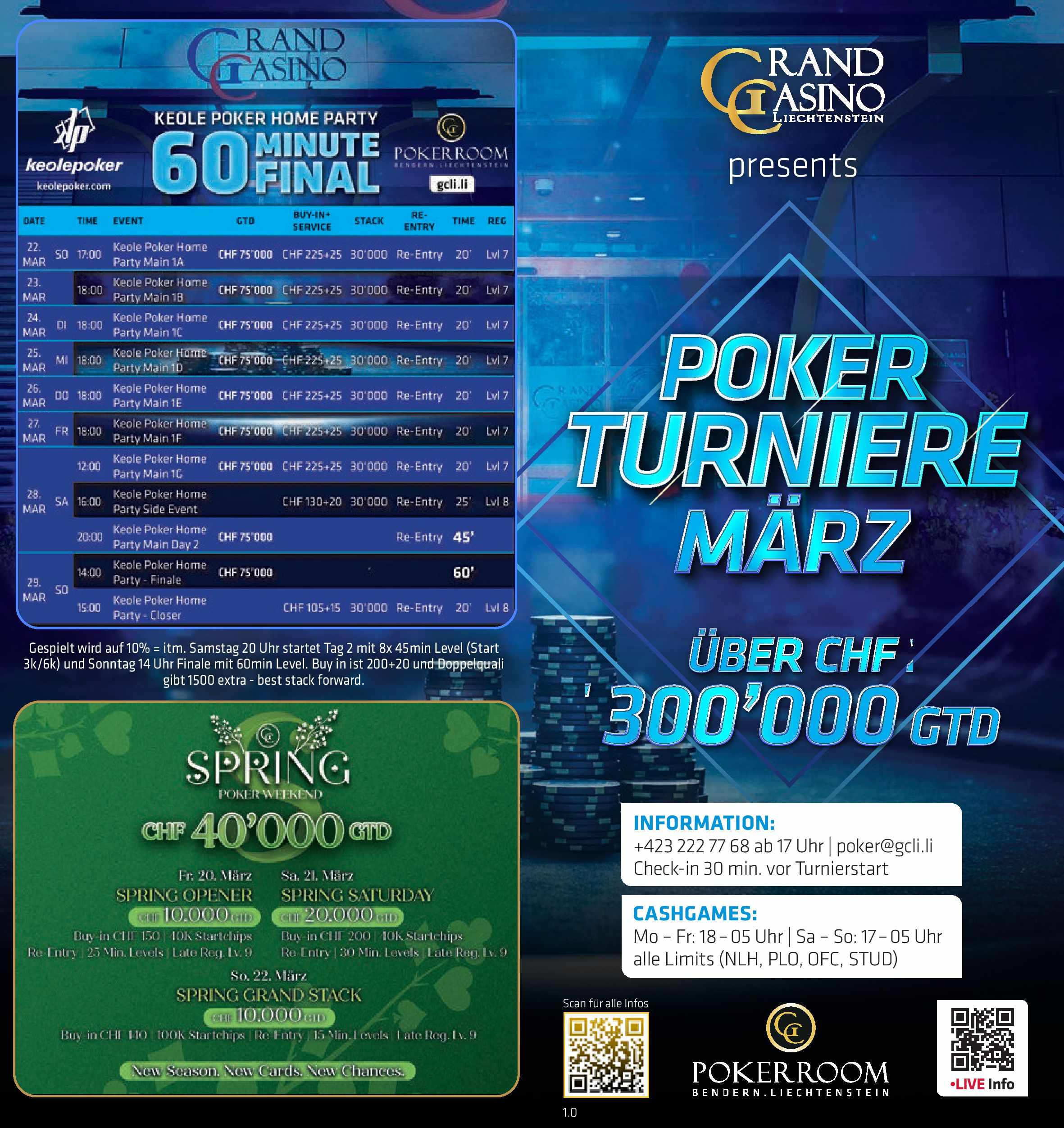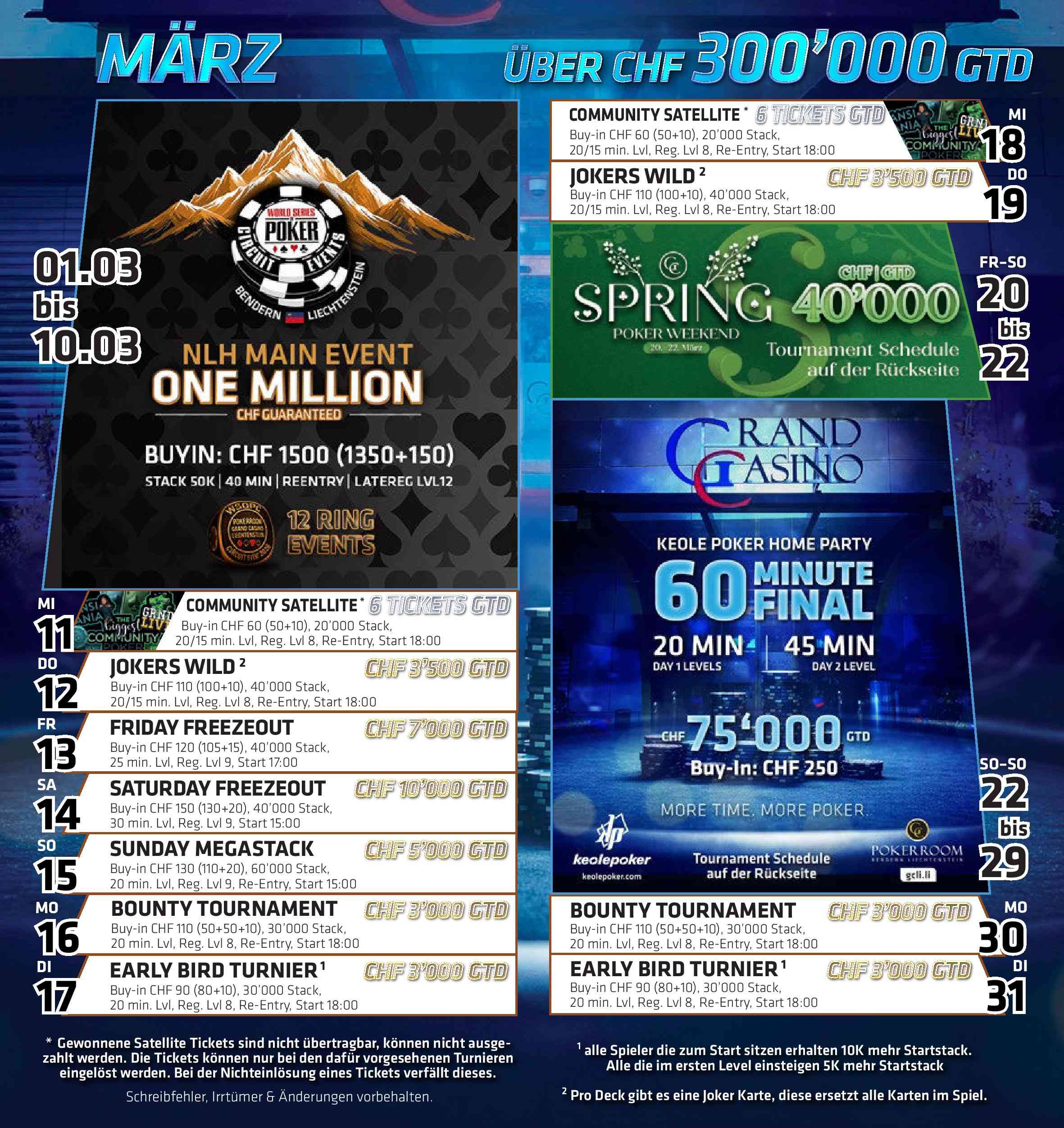 Heute geht es dann im Grand Casino Liechtenstein Pokerraum um 12:00 Uhr weiter mit dem Tag 2 des CHF 300 Mini Main Events und um 13:00 Uhr startet das nächste Highlight mit dem CHF 450+50 NLH Mystery Bounty (Tag 1A). Um 18:00 Uhr wird hierfür auch direkt der Tag 1B angeboten.
