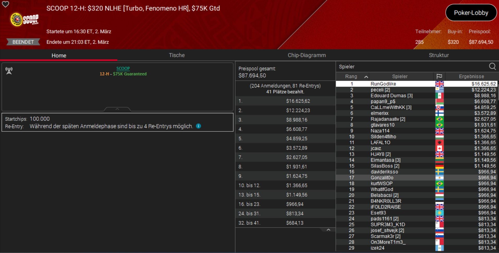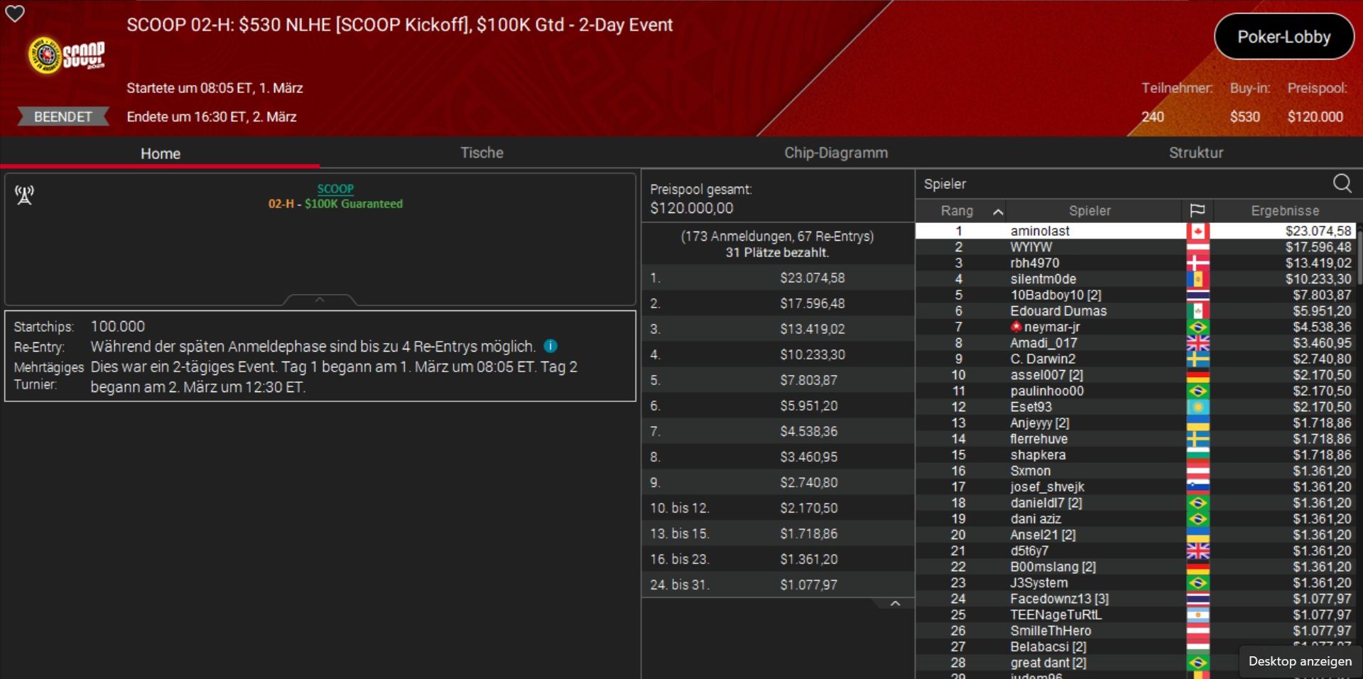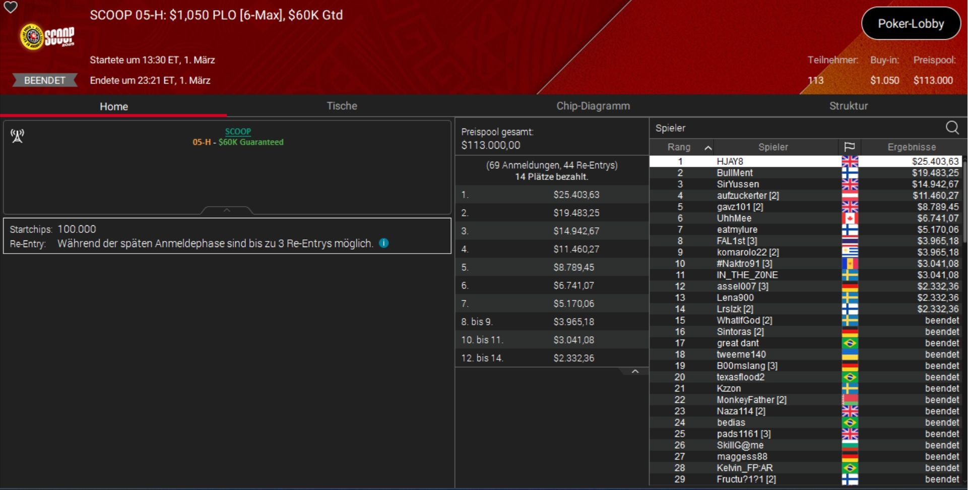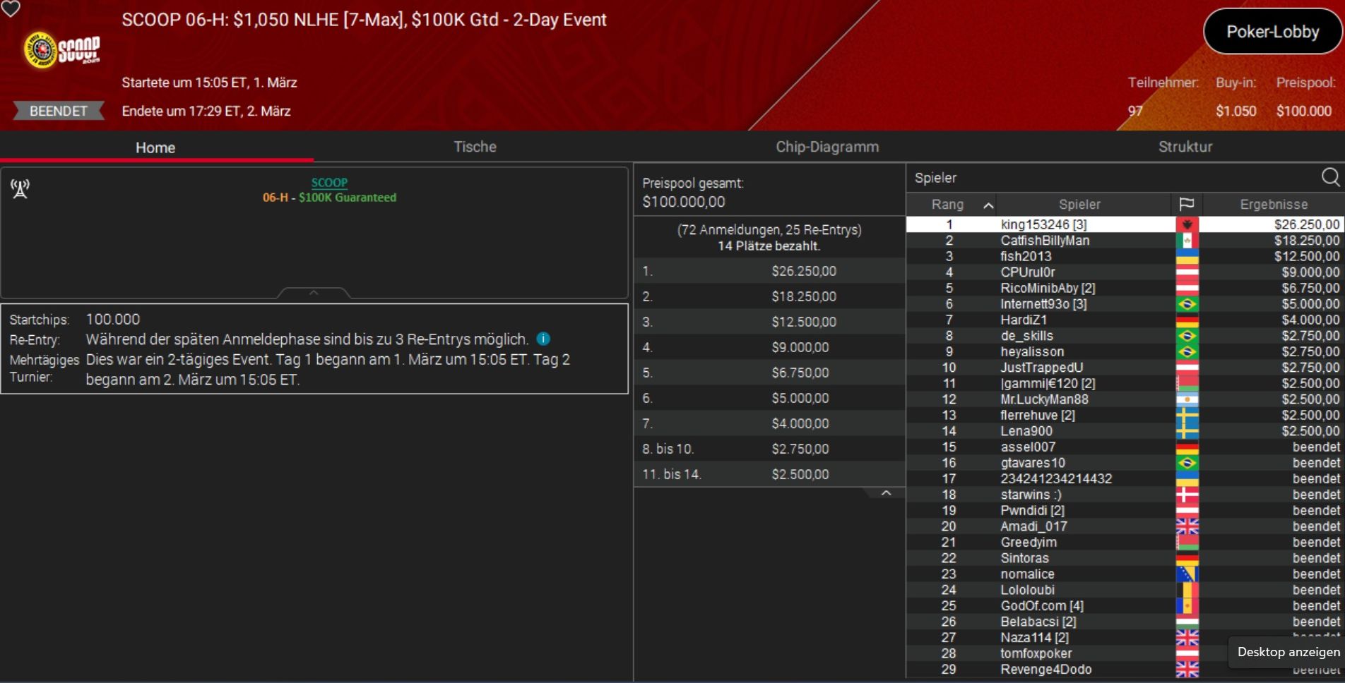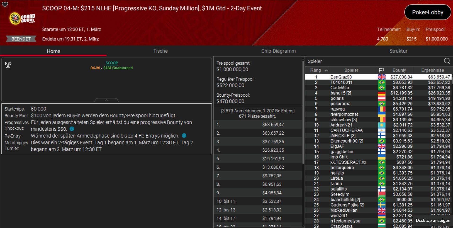 Größter Gewinner des Tages war der Brite „BenGlaz98“, der sich die Sunday Million (Event 4-M) samt einem Preisgeld von rund $100.000 unter den Nagel riss.